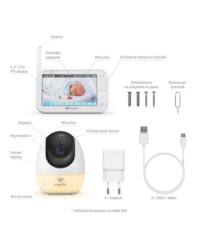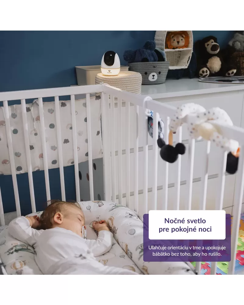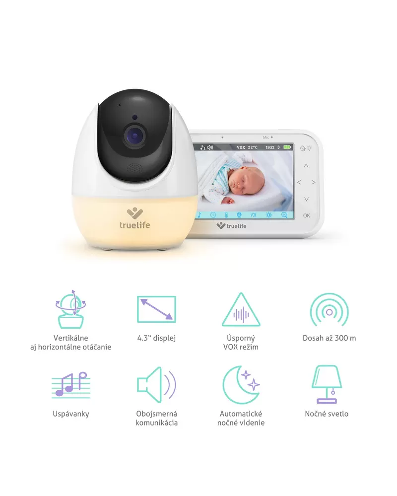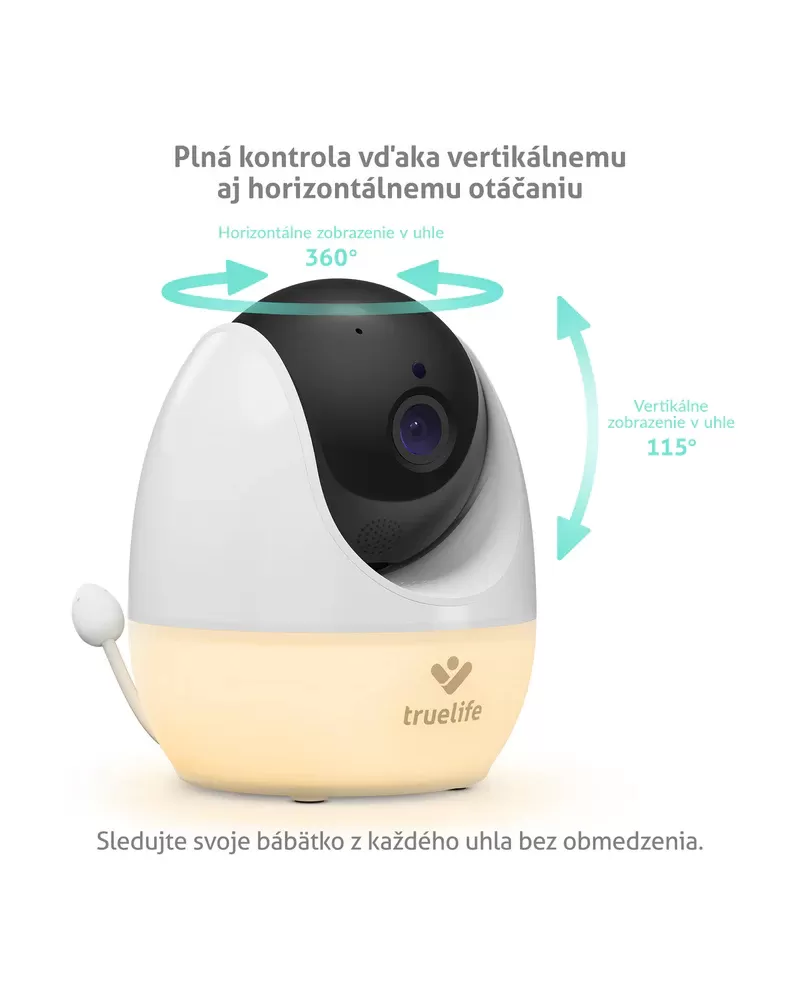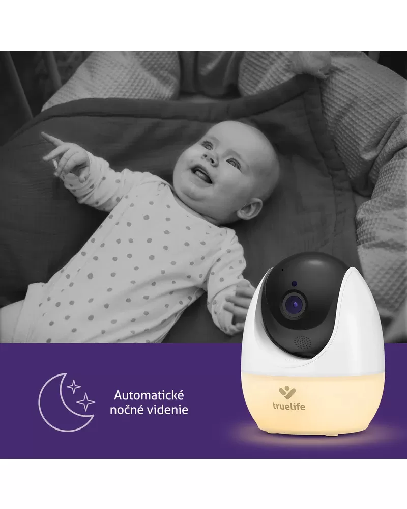 360° rotační chůvička TrueLife NannyCam R4 Pro, 4,3" LCD IPS displej, dosah až 300 m, automatické noční vidění, baterie až 17 h, VOX režim, noční světlo, obousměrná komunikace, 8 ukolébavek, detekce teploty v místnosti, připomenutí. TrueLife NannyCam R4 Pro – Neúnavná pomocnice, které nic neunikne Příchod miminka na svět je nezapomenutelný okamžik a je přirozené, že rodiče chtějí být u každého úsměvu, pohybu a klidného spánku. Jsou však chvíle, kdy s miminkem být nemohou, a tehdy přichází na řadu spolehlivý parťák, 360° otočná dětská chůvička TrueLife NannyCam R4 Pro. Na 4,3" LCD IPS displeji má dítě na dosah, ať jste kdekoli, a to až ze vzdálenosti 300 metrů. Můžete tak bez obav doběhnout pro kurýra nebo pověsit prádlo do sušičky, zatímco váš malý poklad spí. Jakmile se setmí, automaticky se aktivuje noční vidění, takže můžete mít své dítě dokonale na očích i v noci. Baterie vydrží až 10 hodin a při zapnutém režimu VOX až 17 hodin. V tomto případě se displej aktivuje pouze tehdy, když chůvička zaznamená zvuk. Pokud se vaše dítě probudí, můžete ho díky obousměrné komunikaci uklidnit svým hlasem dříve, než se k němu dostanete. K dispozici je také 8 uklidňujících ukolébavek, které pomáhají navodit pocit bezpečí. Praktické funkce, jako je detekce pokojové teploty a připomínání krmení, usnadňují každodenní péči, a to i při podávání léků během nemoci. A protože děti nerady usínají potmě, nabízí chůvička také příjemné noční osvětlení. Pro ještě větší pohodlí můžete k rodičovské jednotce připojit další kameru a sledovat více místností najednou. Kamera TrueLife NannyCam R4 Pro je nejen chůvičkou, ale také vaším neúnavným pomocníkem, který vám pomůže najít rovnováhu mezi péčí o dítě a vším ostatním, co k rodičovství patří. Jejímu „oku” nic neunikne Dokonalý přehled o dění v pokojíčku a bezpečnosti vašeho miminka budete mít díky 4,3" LCD IPS displeji ve dne v noci, a to stále v jasném a kvalitním obraze. IPS technologie zlepšuje věrnost barev a rozšiřuje pozorovací úhly, po setmění se automaticky aktivuje noční režim, při kterém infračervené diody zajišťují dokonalý obraz i ve tmě. 360° otočná dětská chůvička se otáčí přes rodičovskou jednotku do všech směrů a vidí do každého rohu. Spolehlivě hlídá a umí i utěšit I když chcete být pořád s miminkem, někdy je třeba odběhnout uklidit, nebo načerpat energii. Chůva vaše nejmenší spolehlivě pohlídá až na vzdálenost 300m. Ve chvíli, kdy je dětí více, máte možnost k rodičovské jednotce připojit další kameru a mít tak chůvičku pro každé z nich. Chvíle, kdy se dítě vzbudí a začne plakat, řeší obousměrná komunikace, ta vám dává možnost uklidnit ho vlastním hlasem, než k němu doběhnete. Uklidňující jsou však pro miminko i ukolébavky, kterých má chůva v repertoáru hned osm. Praktická chůva, která má výdrž U chůvičky TrueLife NannyCam R4 Pro se můžete spolehnout nejen na její ostražitou kameru, ale také na výdrž. Bezpečnost děťátka pohlídá dlouhé hodiny. Běžně baterie vydrží až 10 hodin, ale když zapnete úsporný VOX režim, prodlouží se výdrž baterie až na 17 hodin. Displej je totiž v tomto režimu vypnutý a aktivuje se pouze v případě, kdy detekuje zvuk. Pro dětský komfort monitoruje chůva i teplotu v místnosti a je vybavena nočním světlem. Umí také připomenout krmení, ačkoli na to většinou miminko upozorní samo. Tato funkce se však hodí také u starších dětí, například v nemoci při podávání léků. Vertikální i horizontální otáčení Kameře chůvičky opravdu nic neunikne. Prostřednictvím rodičovské jednotky ji otočíte horizontálně o 355° a vertikálně o 105°. Pozorovací úhel tak má 360° horizontálně a 115° vertikálně. Vidí zkrátka všude. 4,3" LCD IPS displej Rodičovská jednotka je vybavena 4,3" LCD IPS displejem. IPS technologie nejen vylepšuje věrnost barev, ale také poskytuje širší pozorovací úhly. Velký dosah Dosah rodičovské jednotky je až 300 metrů, můžete se tak naprosto svobodně pohybovat po bytě, domě i zahradě a stále máte vše pod kontrolou. Automatické noční vidění Jakmile se začne šetřit, chůvička detekuje sníženou viditelnost a automaticky aktivuje noční režim. Dokonalý obraz tak zůstává zachován. VOX režim Tento úsporný režim zařídí, že baterie vydrží o několik hodin déle. Displej je při něm vypnutý a aktivuje se pouze při detekci zvuku. Obousměrná komunikace Chůva umožňuje slyšet každý zvuk, zároveň však dává prostor, abyste na dálku dítě uklidnili vlastním hlasem. Detekce teploty v místnosti Chůvička neustále monitoruje teplotu v místnosti s miminkem a při větším výkyvu vás upozorní. Noční světlo Tma nebývá dětem příjemná, proto je chůva vybavena nočním světlem, které lze zapnout na kameře i prostřednictvím rodičovské jednotky. Značná výdrž baterie Baterie chůvičky vydrží na jedno nabití až 10 hodin, pokud však aktivujete úsporný režim, výdrž se zvýší až na 17 hodin. Ukolébavky Můžete svému miminku ukolébavku zazpívat, nebo využít některou z 8 uklidňujících melodií chůvičky. Připomenutí krmení Rodičovskájednotka je vybavena funkcí, která vám připomene krmení nebo ji využijete při podávání léků. Více kamer pro větší přehled Někdy je třeba pokrýt a uhlídat větší prostor, například máte-li více dětí. V těchto chvílích máte možnost připojit k rodičovské jednotce další kameru. Technické specifikace Rodičovská jednotka: - Displej: 4,3" LCD IPS, (480 × 272) - Dotyková tlačítka: Ano - Výdrž baterie: až 10 hodin se zapnutou obrazovkou