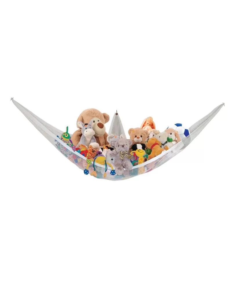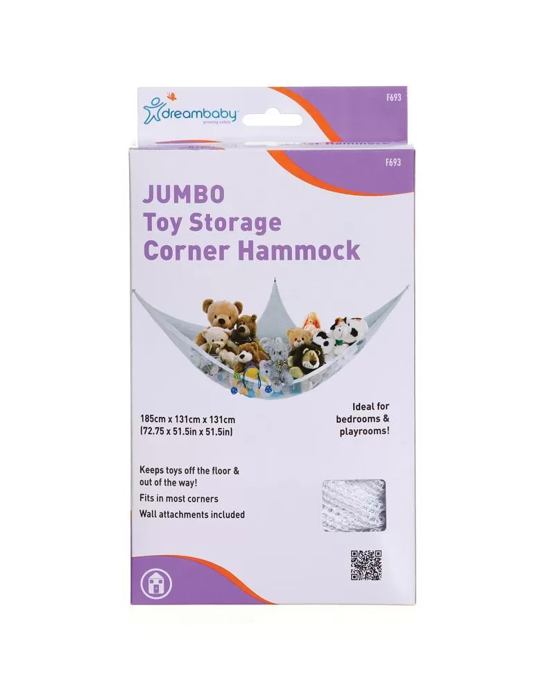 Rohová houpací síť pro ukládání hraček Dreambaby® Jumbo je ideální způsob úhledného a atraktivního ukládání hraček. Děti budou mít rádi pohádkový způsob jejich vystavení. Vlastnosti: - Hodí se do většiny rohů - Včetně nástěnných doplňků - Měření: 1,85 x 1,31 x 1,31 m