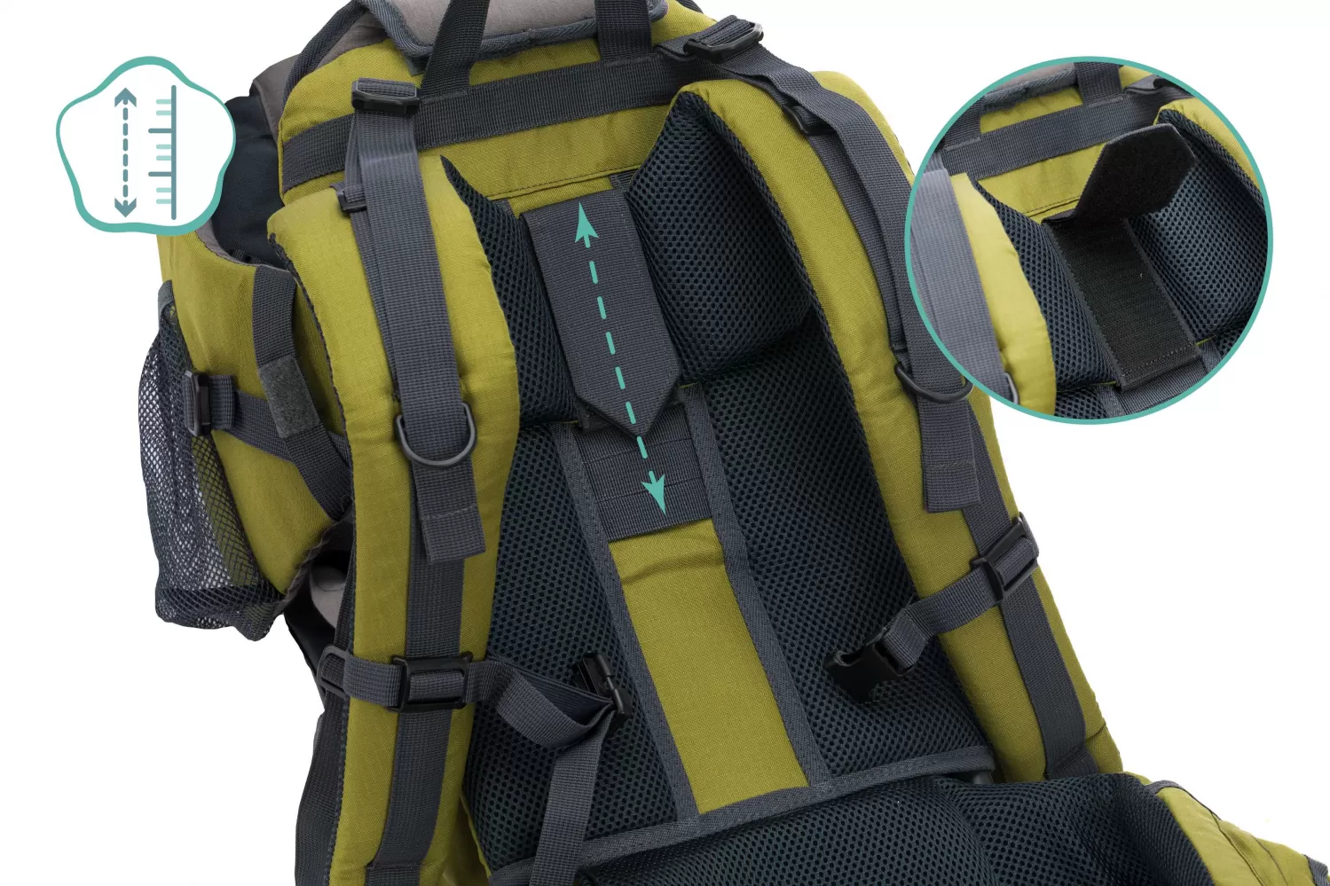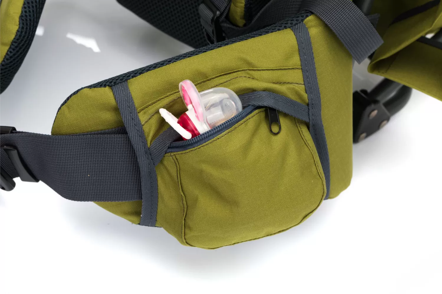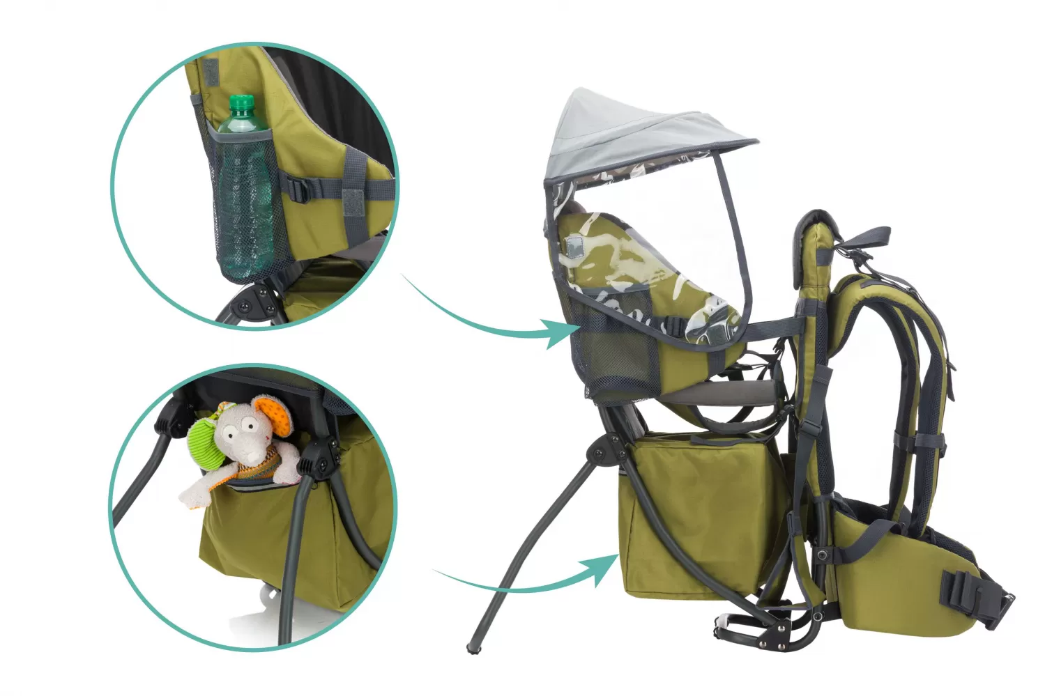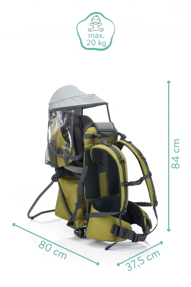 Vzduchový ventilační systém zádové opěry a nosné popruhy zajišťují příjemné chlazení. Velký úložný prostor pod sedadlem dítěte umožňuje přepravu různého nádobí. Další 2 přihrádky na láhve poskytují dostatek místa pro láhve na pití.