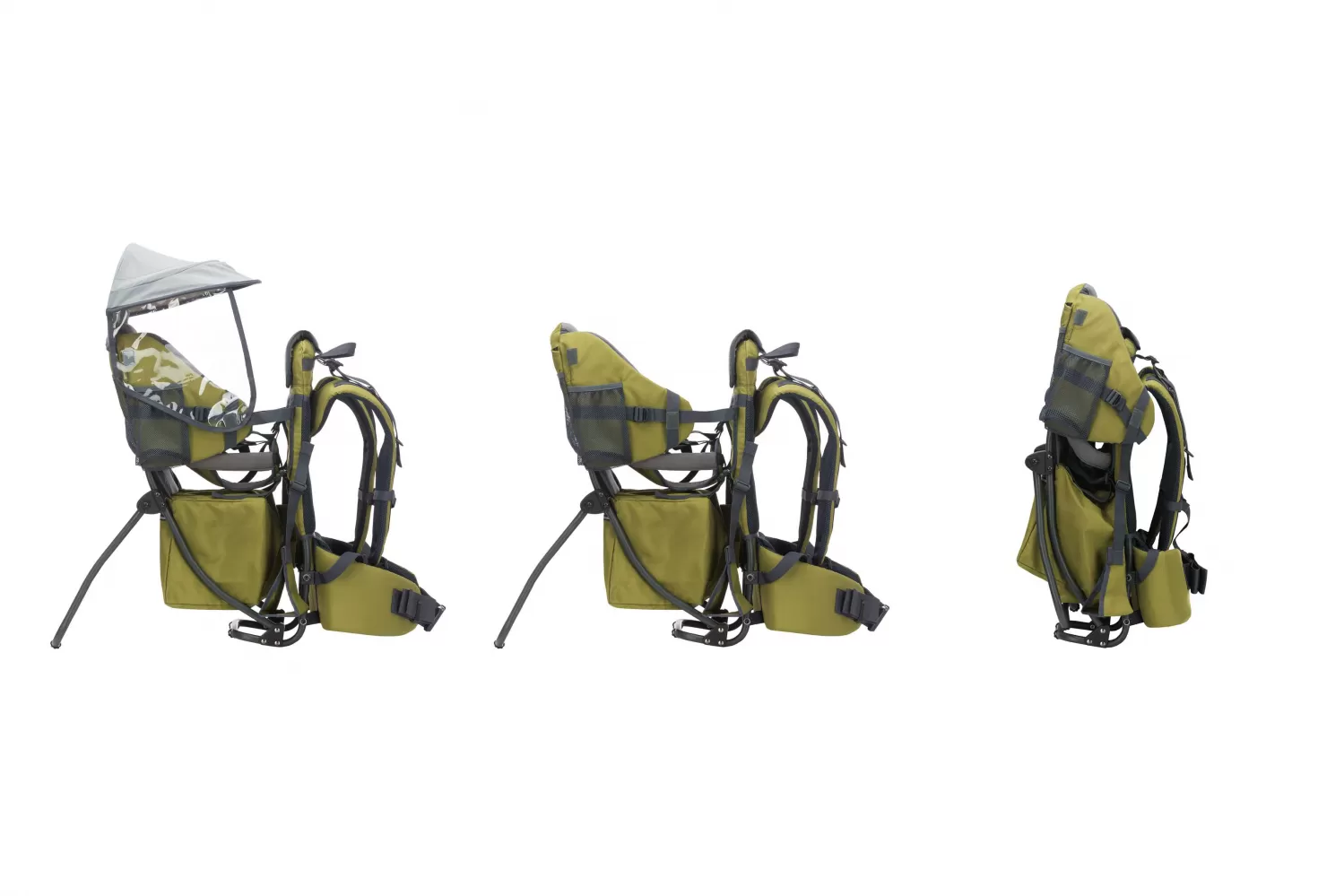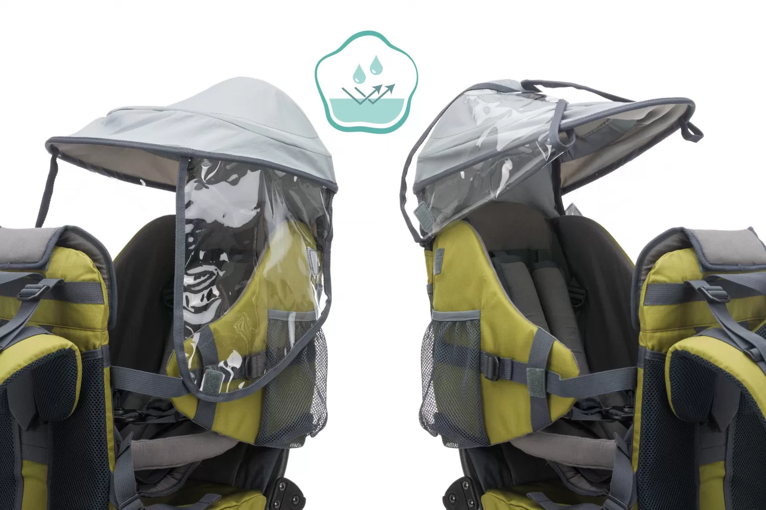 Všechny vnitřní části sedačky jsou měkké a pohodlně polstrované a všechny části popruhů jsou multifunkčně nastavitelné. Stříšky proti slunci a dešti se snadno připevňují a zajišťují optimální ochranu před všemi povětrnostními vlivy.