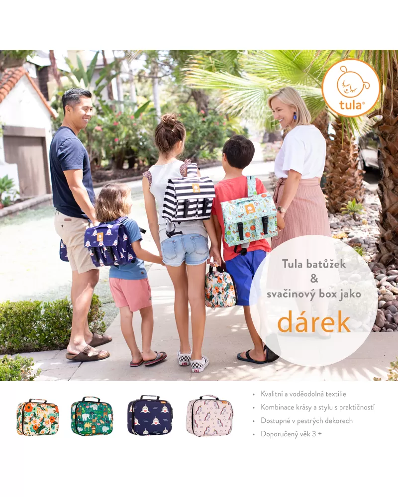 Pokračujte v tom, co máte rádi přesto, že vaše děti stále rostou. Přidejte proto do výbavy svých dětí skvělou lehkou tašku na záda! S rozkošnou novou řadou dětských batohů umožňujeme pokračovat s milovanou značkou Tula a především, když vaše dítě vyrazí na cestu svého vlastního dobrodružství. Každý batoh Tula je vyroben z vysoce kvalitní, voděodolné tkaniny v nostalgickém evropském designu, který dokonale kombinuje základní praktické funkce s okouzlujícím stylem. Batohy Tula mohou obsahovat celou škálu školních a hracích potřeb. Svou velikostí spolehlivě uspokojí malinké i velké děti.