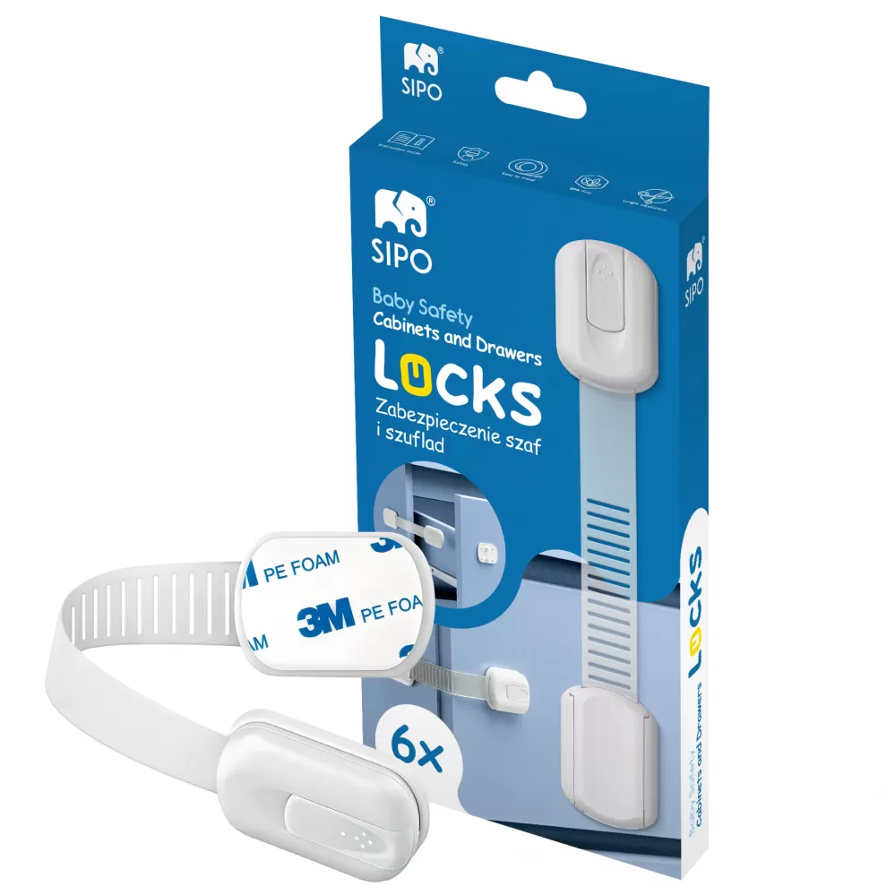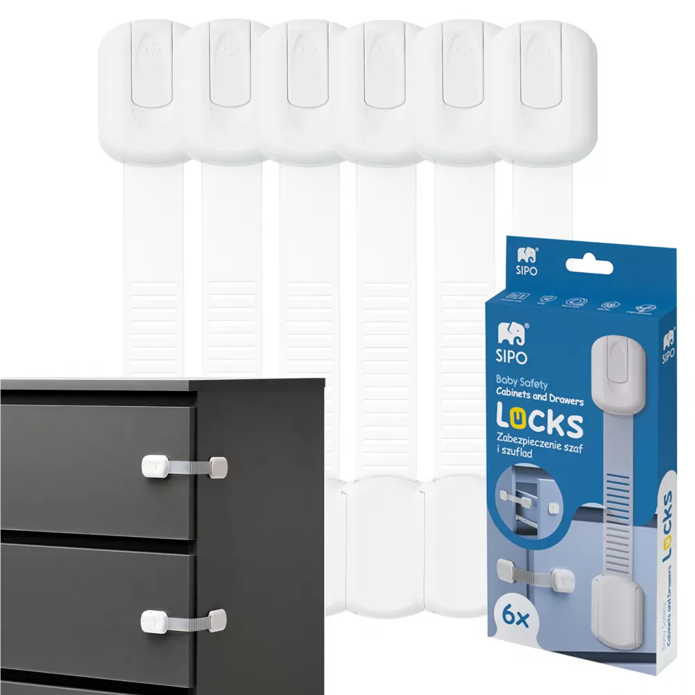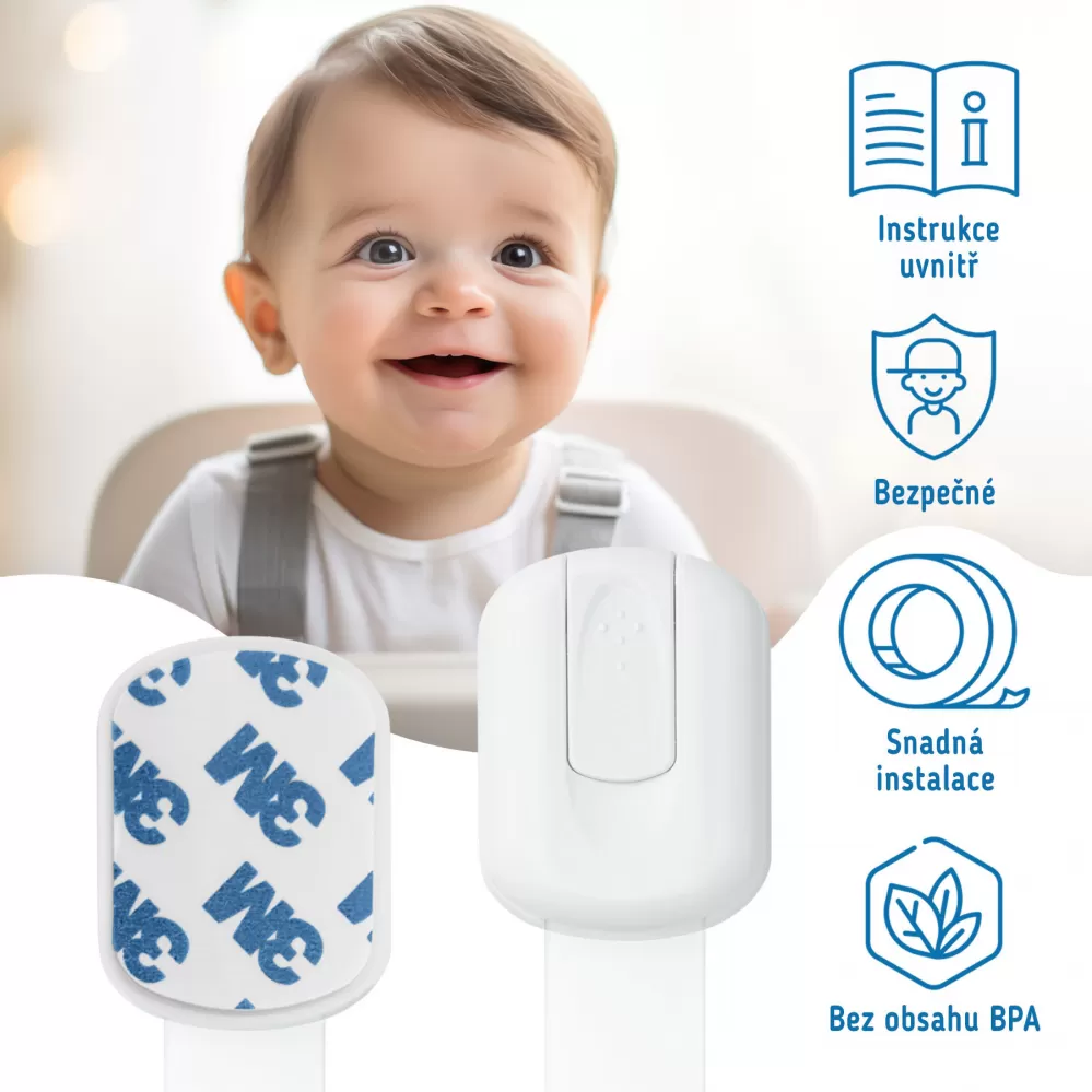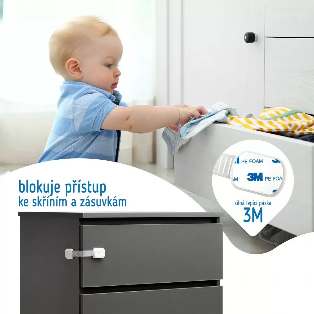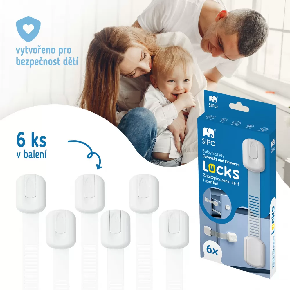 Sada 6ks SIPO dětských bezpečnostních zámků na skříňky a zásuvky s nastavitelnou délkou a systémem zavírání na západku, který umožní rychlý přístup dospělým, ale ochrání před otevření malými dětmi.