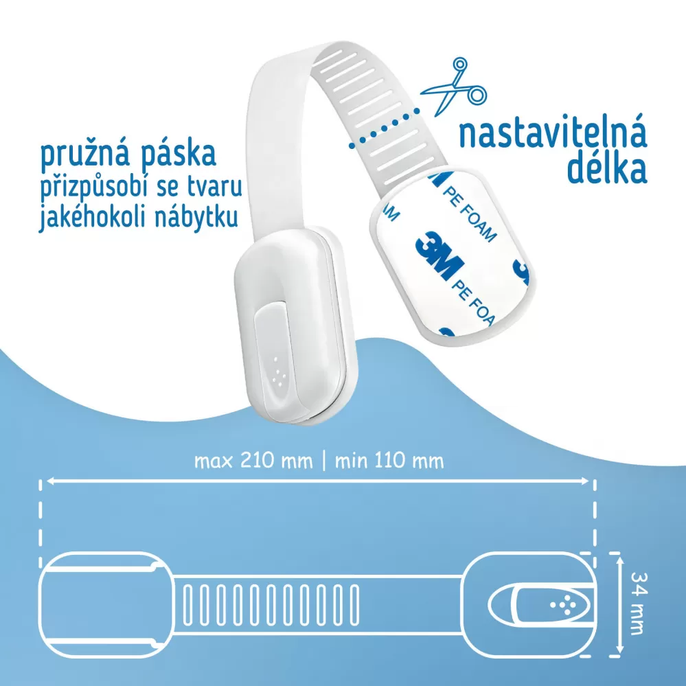 Univerzální použití – nastavitelná délka, díky níž se bezpečnostní pomůcka hodí téměř ke všem domácím spotřebičům a nábytku jakékoli velikosti.
