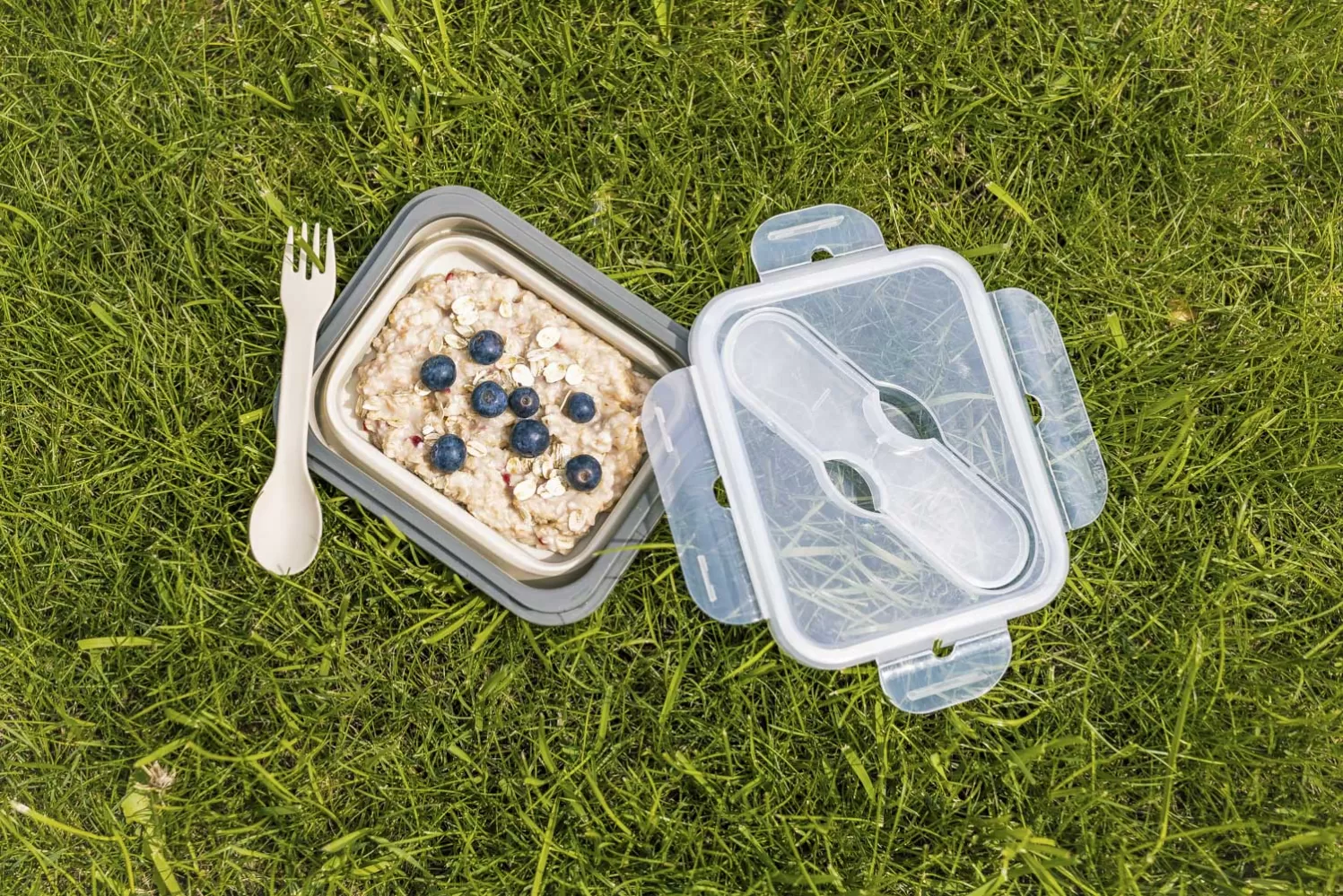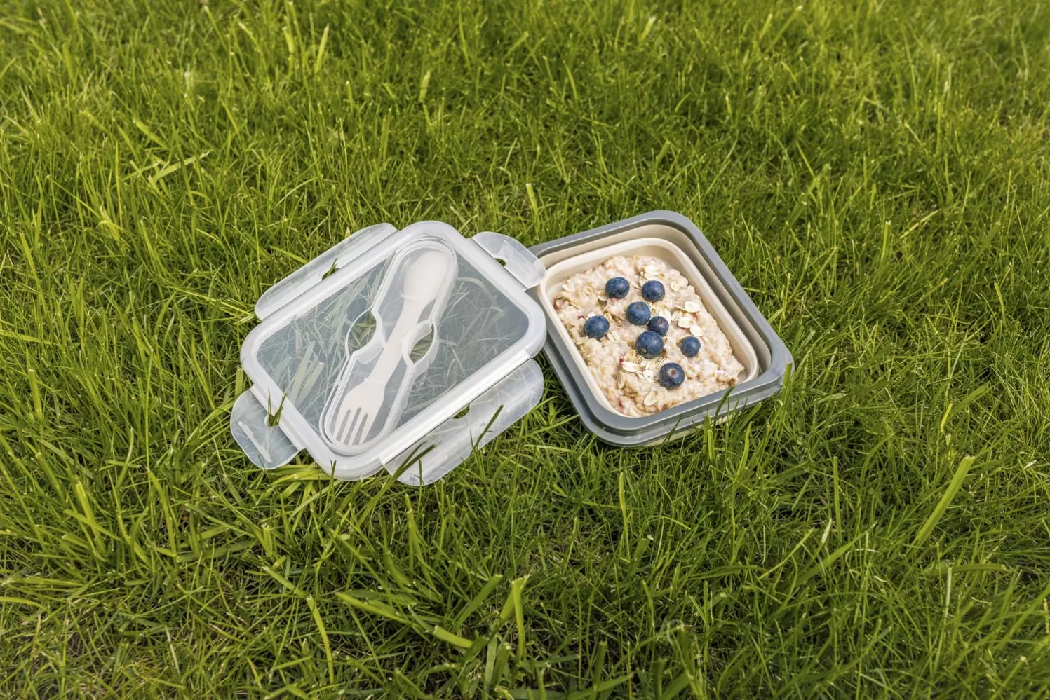 Tento svačinový box je vyroben z bezpečného potravinářského silikonu, který je netoxický a odolný proti rozbití. Jeho velkou výhodou je snadné složení, díky kterému zmenší svůj rozměr až o 60 % a tak je z něj ideální společník na výlety. Víčko velmi dobře těsní, má v sobě zabudovanou přihrádku na příbor, lžička s vidličkou jsou součástí v praktickém pouzdře.