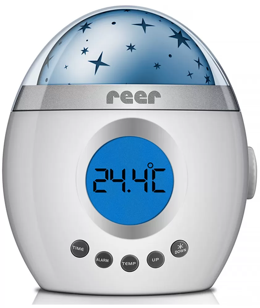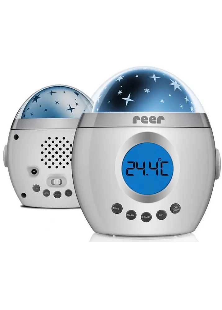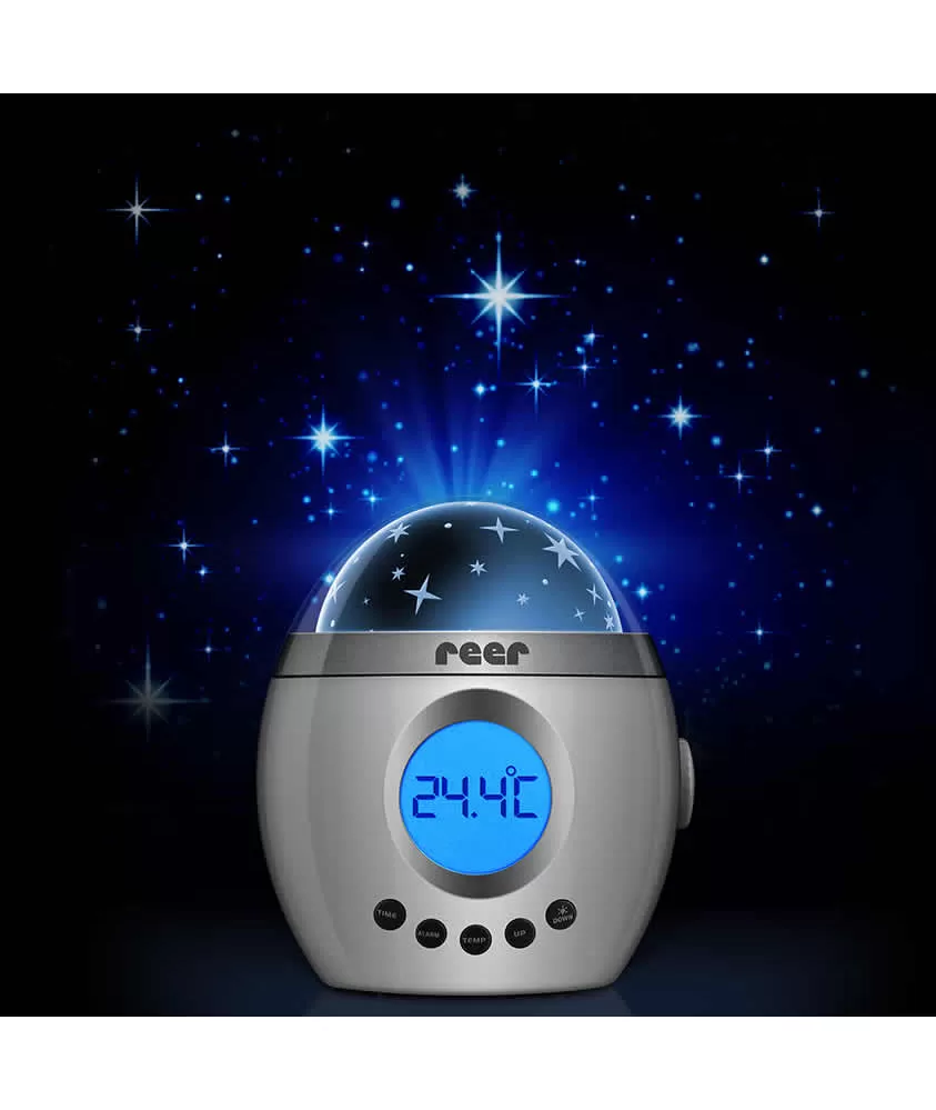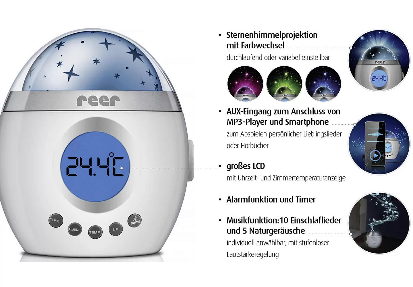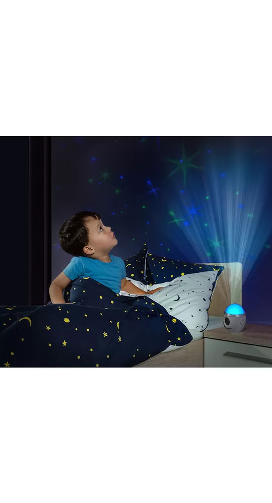 Uklidňující projekce světla s hvězdnou oblohou a změnou barev. Připojení AUX pro přehrávač MP3, smartphone a počítač umožňují individuální přehrávání oblíbených skladeb a audioknih, uložený výběr zvuku: 5 zvuků přírody, 10 ukolébavek, 3-stupňový časovač přepínání: 15min-30min-60min, s LCD s displejem - hodiny / pokojová teplota. Věkové doporučení: 36 + měsíců