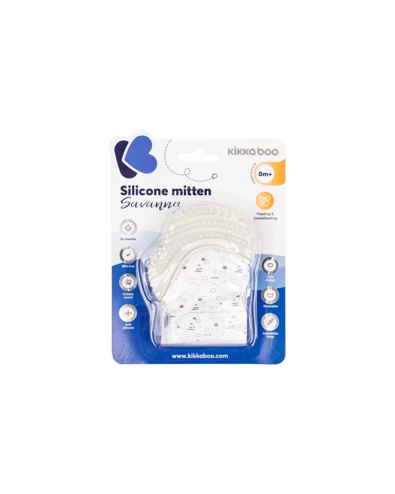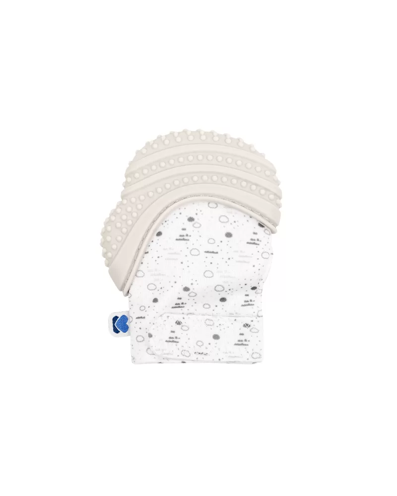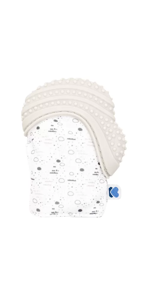 Měkká ruavička s horní částí z jemného potravinářského silikonu pomáhá chránit dítě před poškrábáním vlastními nehtíky. Díky silikonové části s jemnými výstupky funguje i jako kousátko, které pomáhá dítěti připrořezávání prvních zoubků. Šusticí materiál upoutá pozornost dítěte.