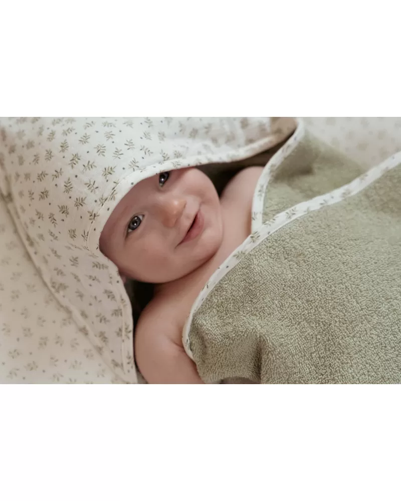 Měkká froté osuška s kapucí z jemné organické bavlny je ideální pro snadné a rychlé osušení a zabalení dítěte po koupeli.