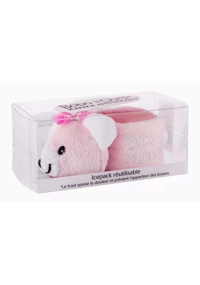 Chladivou kostku ledu, která se aplikuje na bolestivé místo. Okamžitě zklidňuje bolest. Jak se používá? Bobo l´Ours se uloží do chladničky. Není třeba vyndávat kostku z plyše. V případě úrazu, stačí vzít Bobo l´Ours z chladničky – hned je připraveno k použití.