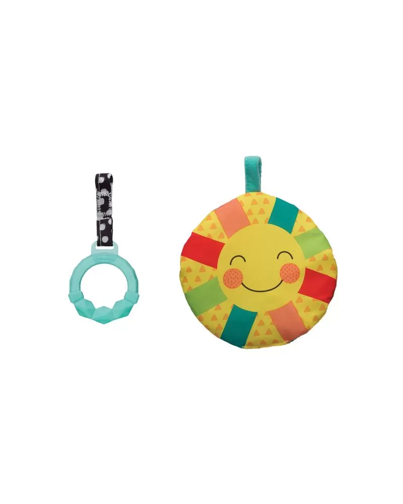 Odnímatelné hračky včetně kousátka je možné připevnit na různá místa na polštářku.