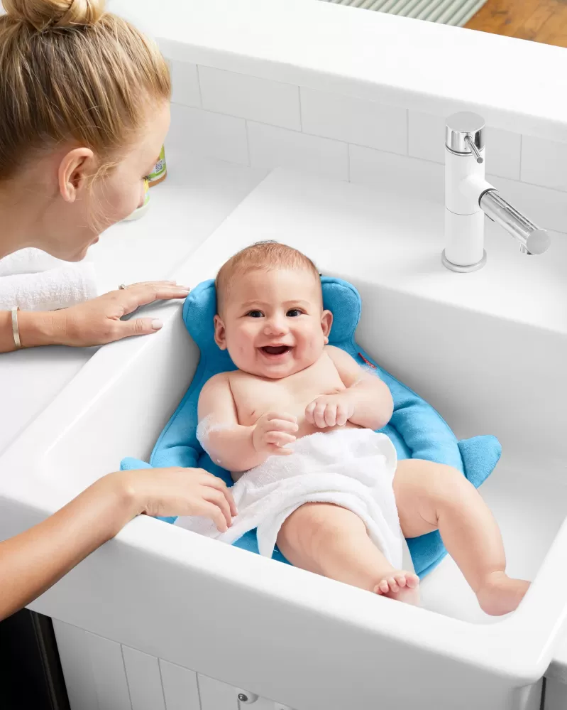 Podpůrná podložka pro první koupání pro novorozence s měkkým froté povrchem a polstrovanou podpěrkou pod hlavičku. Podložka vytvoří děťátku pohodlí při koupání. Síťovina na dně podložky umožňuje rychlé vypuštění vody a poutko Velcro® umožňuje jednoduché zavěšení na rychlejší vysušení.