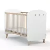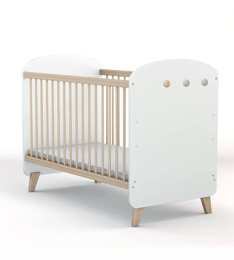 Moderní dětská postýlka s čely vyrobenými z laminované dřevotřísky a s nožičkami, bočnicemi a s roštem z masivu. Povrchová úprava "Baby Friendly"… Celý popis
