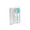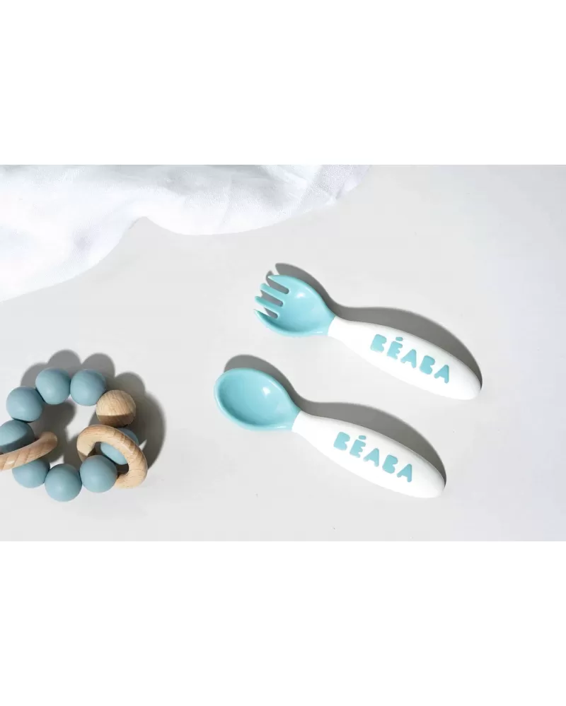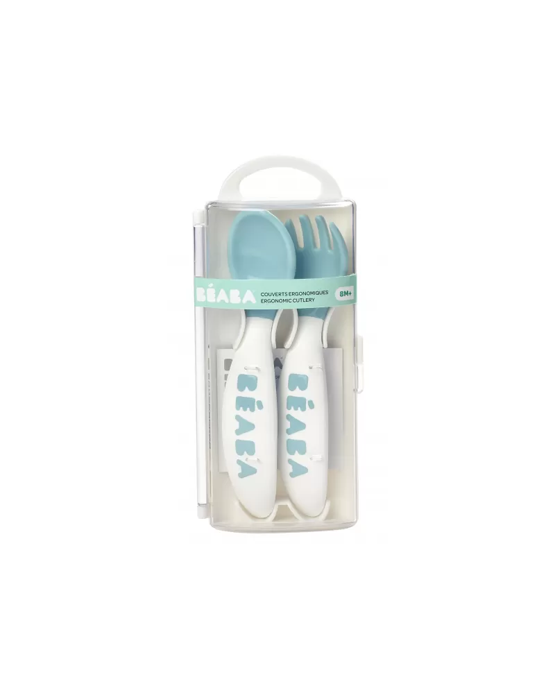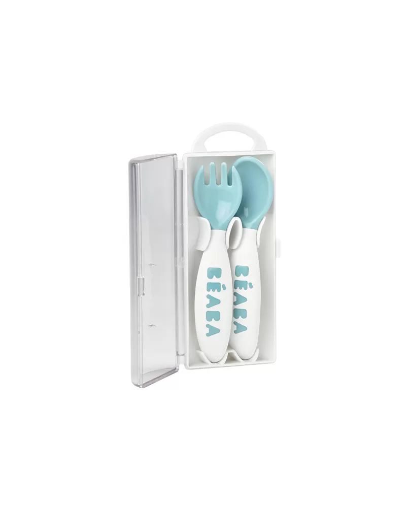 Plastová lžička a vidlička pro první samostatné krmení má ideální tvar pro dětská ústa. Tvar držadla usnadňuje dítěti držení lžičky i vidličky a je vhodný pro praváky i leváky. Praktické pouzdro umožňuje hygienické přenášení lžičky a vidličky např. v přebalovací tašce.