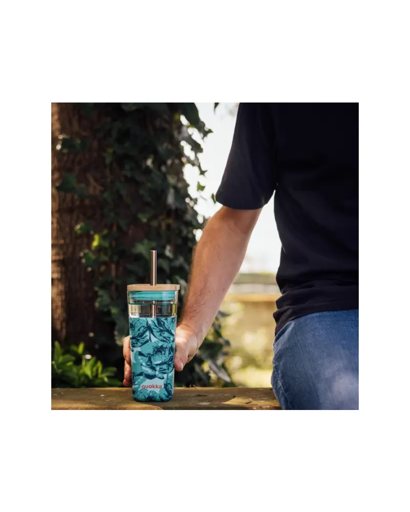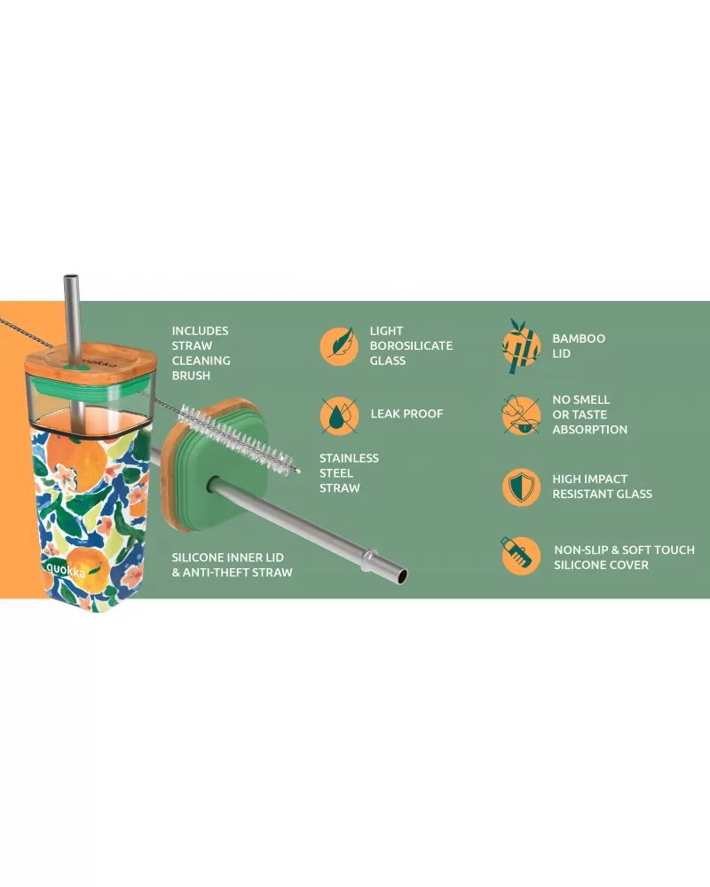 Skleněný cestovní hrnek Quokka Liquid Cube s kovovým brčkem je vybaven spolehlivým těsnicím víčkem z bambusu a silikonu. Protiskluzový silikonový návlek usnadňuje a zpříjemňuje držení hrnku.