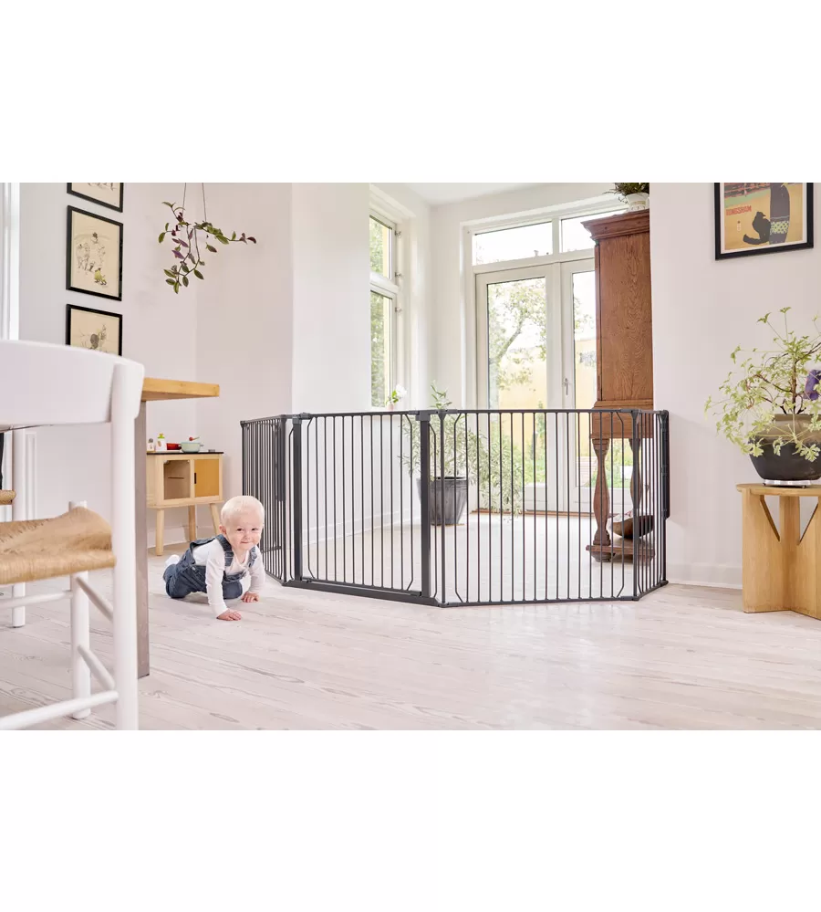 Carl XX Wide je navržen s ohledem na flexibilitu. Zábranu lze nastavit do různých úhlů, aby se přizpůsobila tvaru místnosti – ať už chcete tvar půlměsíce nebo mírně zakřivenou konstrukci. Máte volnost v umístění jednotlivých dílů tak, aby co nejlépe vyhovovaly vašemu prostoru. Zábranou můžete snadno projít pomocí širokých dveří, které lze otevřít z obou stran jednou rukou – užitečná funkce v uspěchaném životě. Díky svému flexibilnímu designu a robustní konstrukci je BabyDan Carl XX Wide spolehlivým řešením pro vytvoření bezpečného prostředí ve větších prostorách. Lze neomezeně prodlužovat pomocí libovolného počtu prodloužení (33 nebo 72 cm prodloužení se prodávají zvlášť)