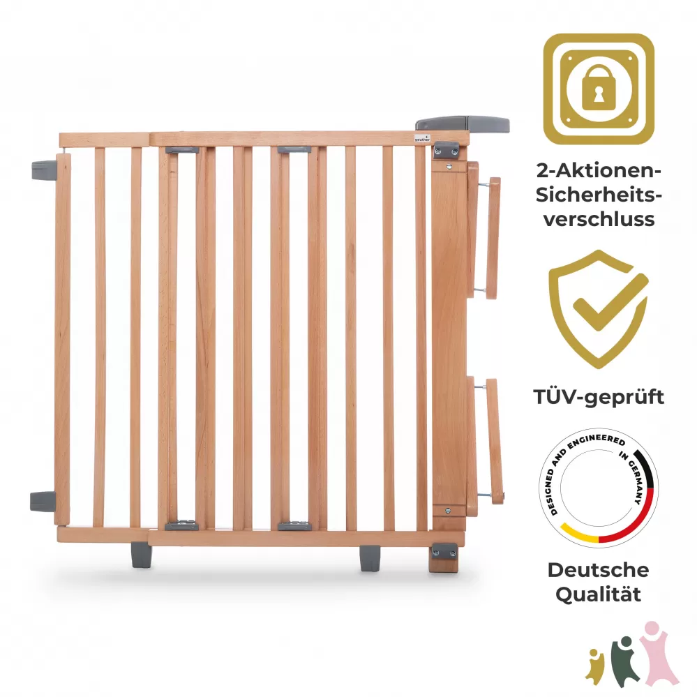 Tato zábrana je bezpečná díky montáži na stěnu nebo zábradlí a umožňuje bezbariérový průchod. To znamená, že není o co zakopnout, díky čemuž je zábrana obzvláště vhodná pro ochranu horní části schodiště. Zaručuje bezpečné uchycení a je extrémně robustní.