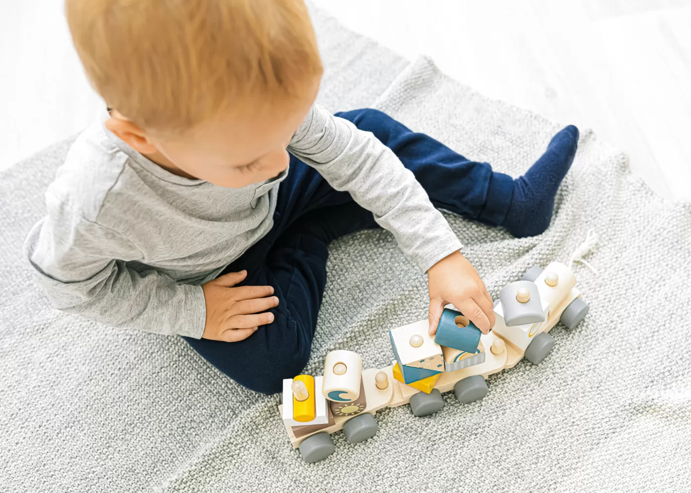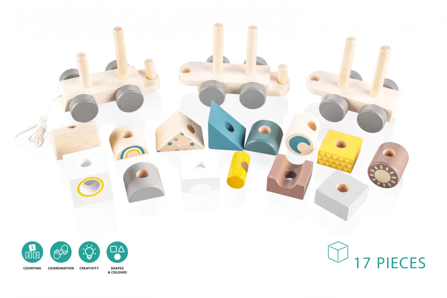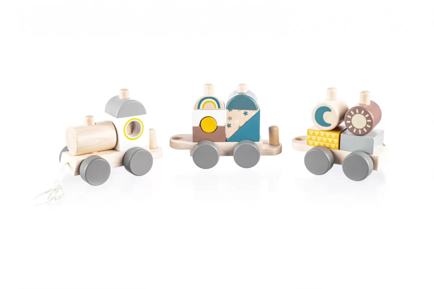 Lze je libovolně skládat na sebe a vytvářet tak různé kombinace vagonů. Až je vláček poskládaný, v přední části obsahuje šňůrku, díky které jej dítě může tahat za sebou.