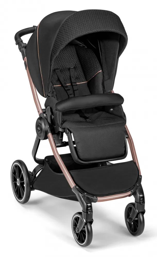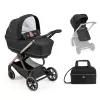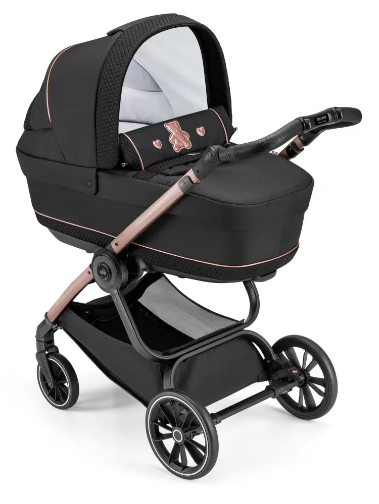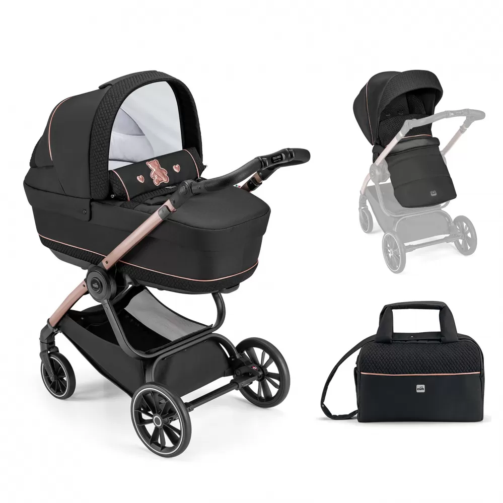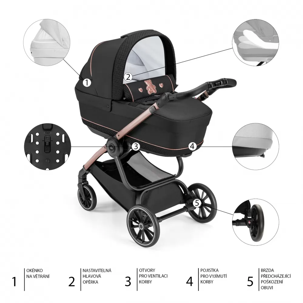 Praktický set obsahuje podvozek, hlubokou korbu a sportovní nadstavbu. To vše v elegantním černém designu s motivem medvídka. Díky kompletu snadno proměníte kočárek pro novorozence ve sportovní kočárek do města.