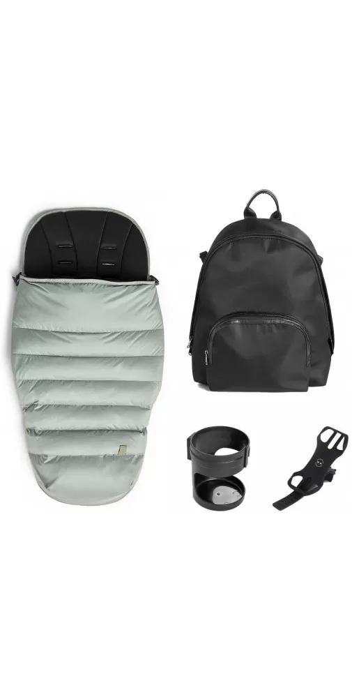 Sada doplňků pro kočárek Silver Cross Tide obsahuje luxusní fusak, stylový přebalovací batoh, držák na nápoje a držák na mobil.