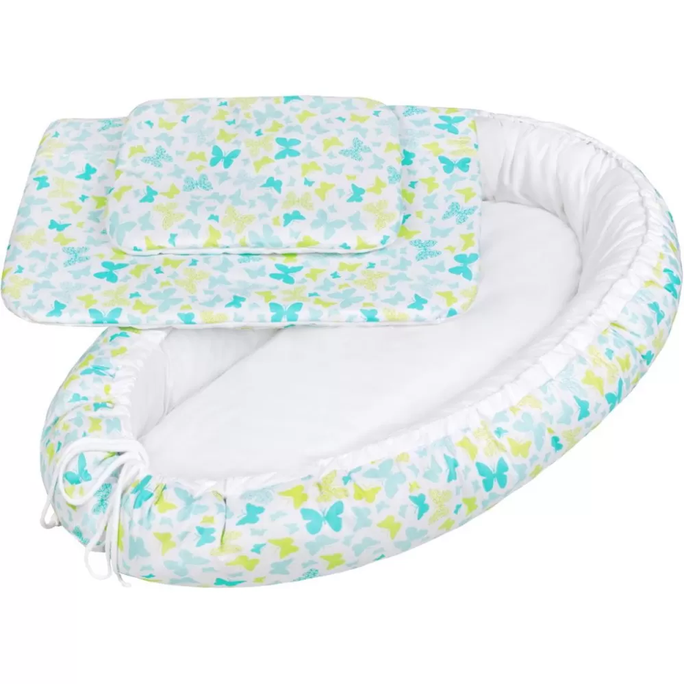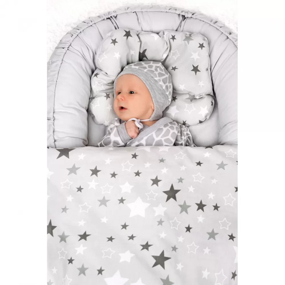 Luxusní hnízdečko s peřinkami pro miminko New Baby. Přenosné hnízdečko pro miminko vhodné od 0-3 měsíců. Je vyrobeno z bezpečných materiálů a je vynikajícím pomocníkem pro první měsíce života miminka. Složení: svrchní materiál: 100% bavlna, výplň: antialergické vlákno. Rozměry: vnější: cca 78x48 cm, vnitřní: 60x31 cm. Složení peřinky: povlak: 100% bavla, výplň: 100% polyester. Rozměry pěřinky: cca 63x46 cm, polštářek: cca 30x22 cm. Peřinky lze využít také do kočárku nebo postýlky. Klademe důraz na kvalitu a proto jsou peřinky do kočárku ušity z velmi kvalitního materiálu, který nepouští barvu, a nevyvolává alergické reakce.