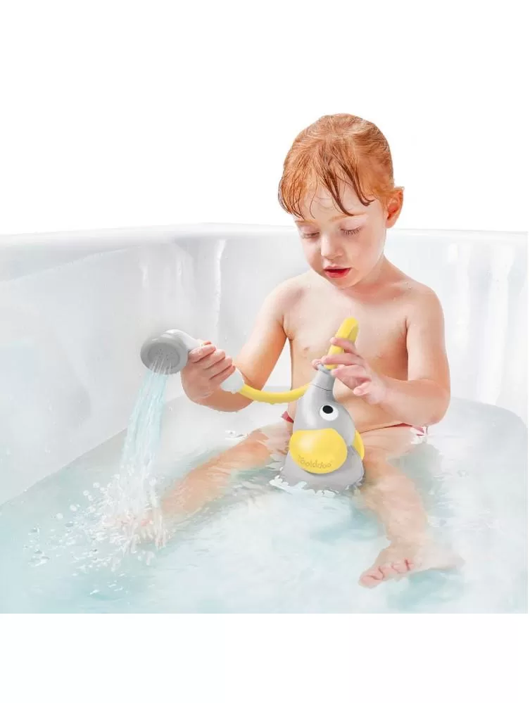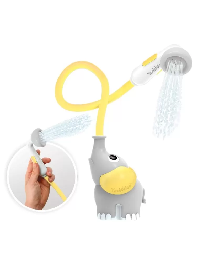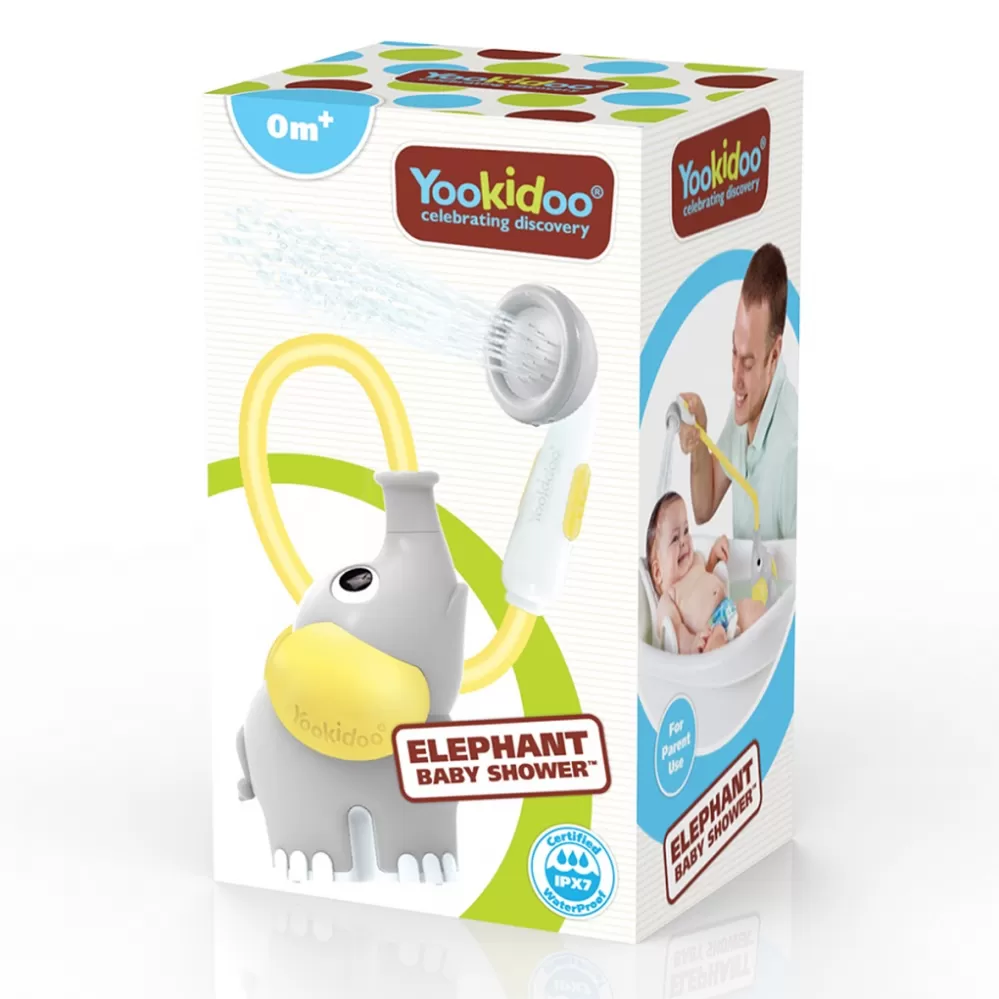 Umístěte sprchovou základnu slona do vody a zajistěte minimální hloubku vody 10 cm. Pro aktivaci proudění vody stiskněte tlačítka umístěná na bočních stranách sprchové hlavice. Přiložte proud vody na nohy dítěte. Když je dítě spokojené, použijte sprchu i na zbytek těla. Jakmile dítě sedí samo, ukažte mu, jak má aktivovat dětskou sprchu. Podporuje hygienické návyky, nezávislost a zábavu. Doporučený věk: od narození