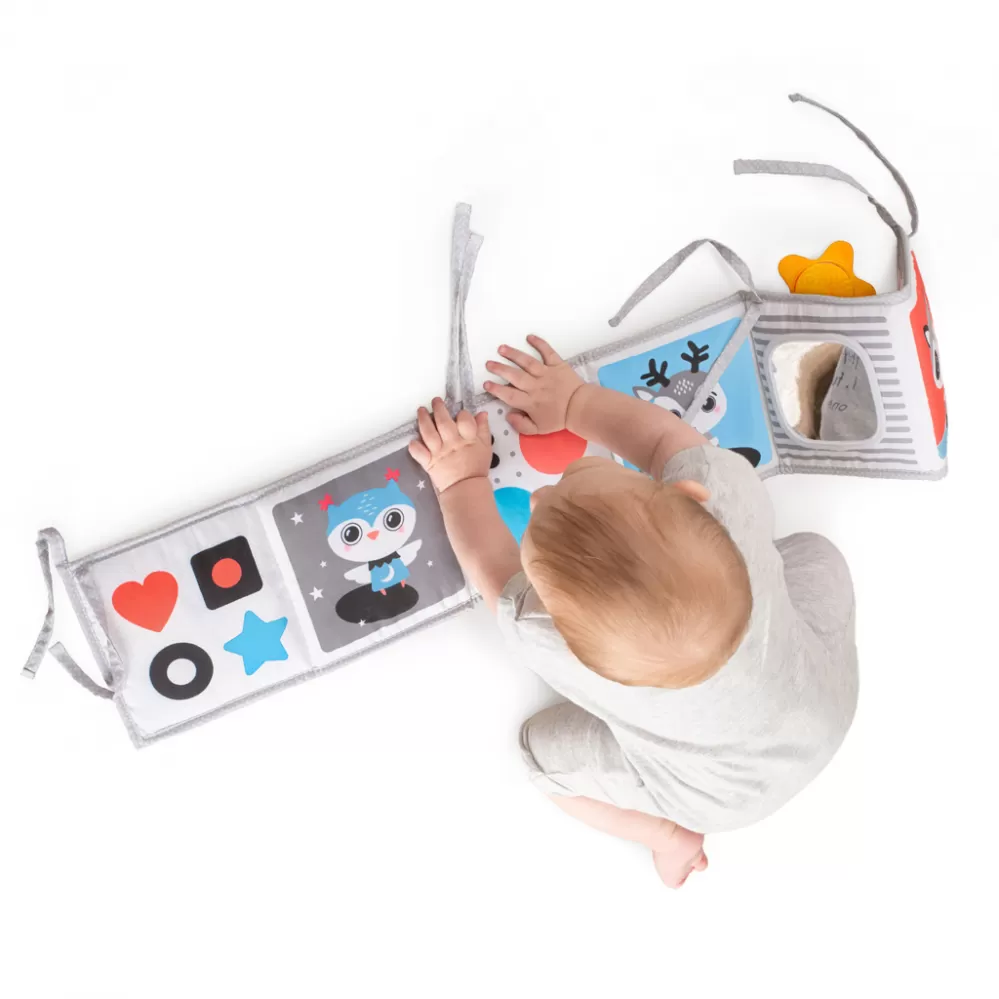 Barevná knížka, která stimuluje zrak a podporuje čas strávený na bříšku, lze používat v kočárku, postýlce nebo jako hračka na podlahu od narození. Stojí samostatně, leží naplocho nebo je svázána. Barevná strana je plná vzrušujících barev a hmatových aktivit na podporu rozvojových dovedností. Snadno se skládá a přenáší kdekoli na cestách. Vlastnosti: - Černobílá strana - fáze 1: Vysokokontrastní obrázky pro brzký vývoj - Obsahuje velké zrcátko pro pozorování na bříšku - Povzbuzení a emocionální inteligence - Barevná strana - fáze 2+3: - Vysoce kontrastní barevné obrázky pro stimulaci zraku dítěte a obohacení vizuální stimulace - Plyšový obláček na hraní podporuje hrubou motoriku - Hmatové stužky rozvíjejí jemnou motoriku - Stojí samostatně, leží naplocho nebo může být svázána - Rozměr: 84 x 16,2cm Uchovejte tento obal, protože obsahuje důležité informace. Před použitím odstraňte všechny obalové materiály a šňůrky. Adresa výrobce: Benbat ltd. 4/19 Hashaked st, Raanana 4322616 Israel info@ben-nbat.com