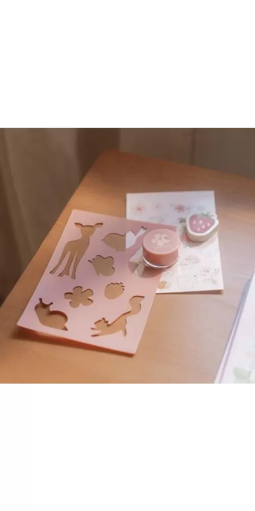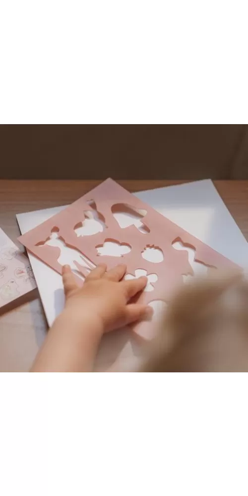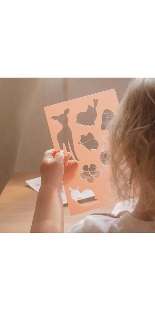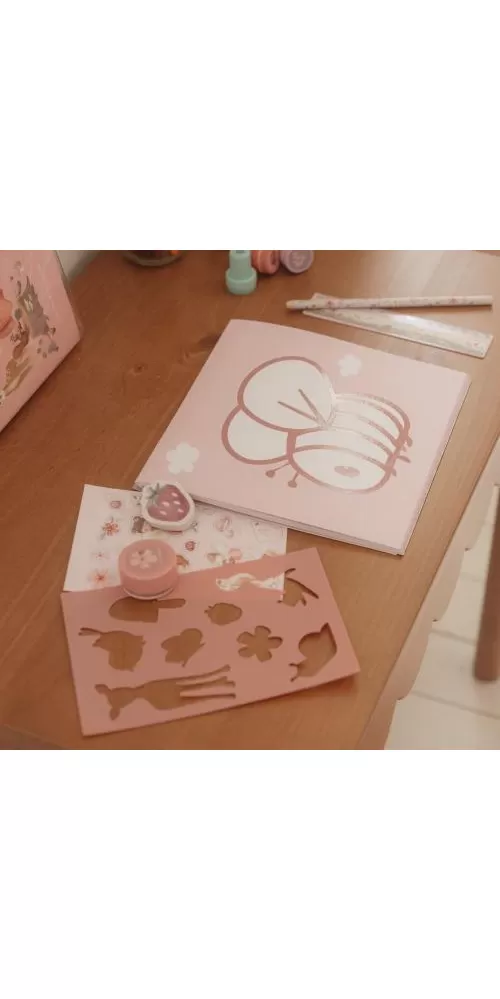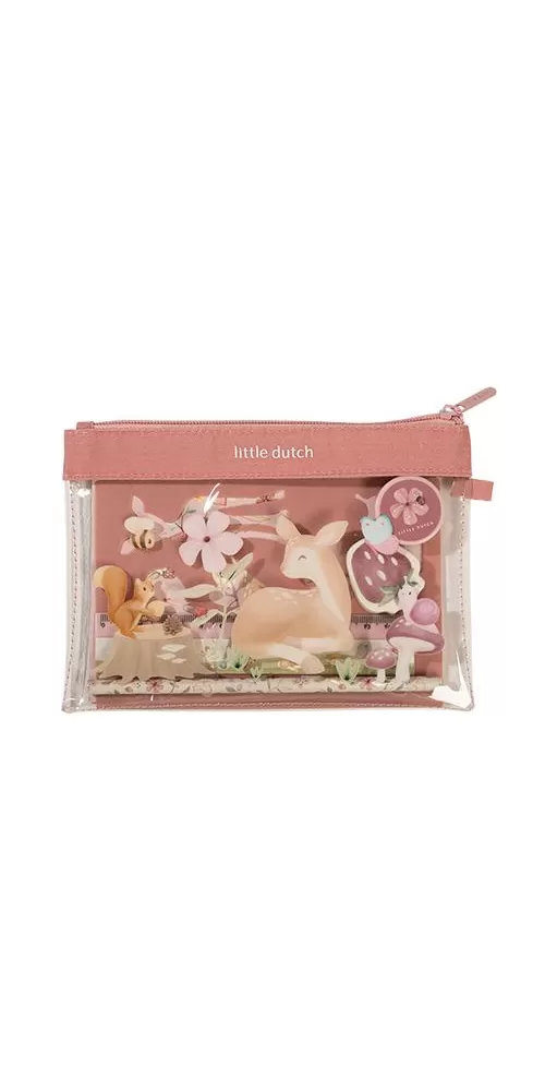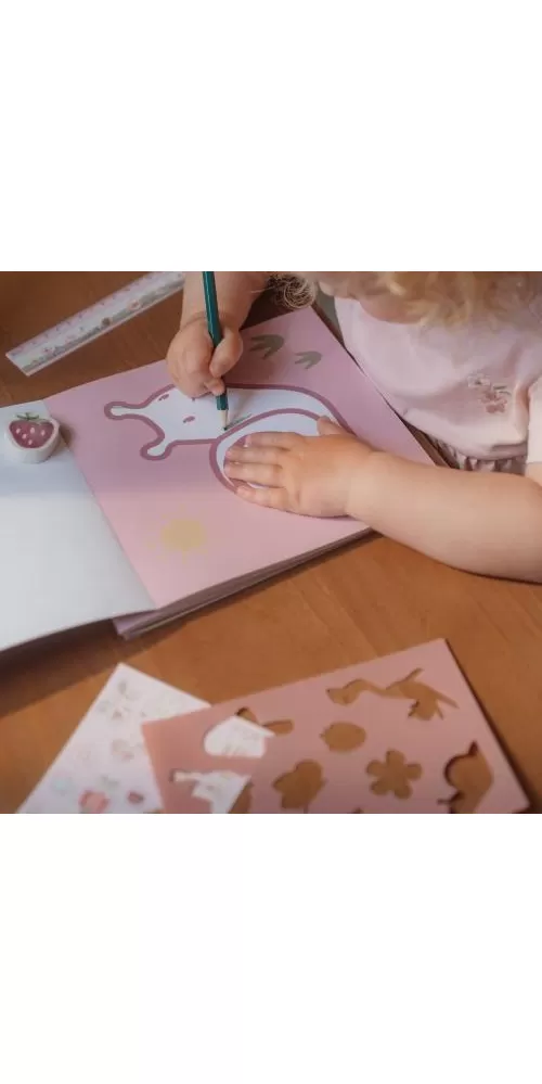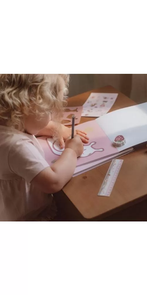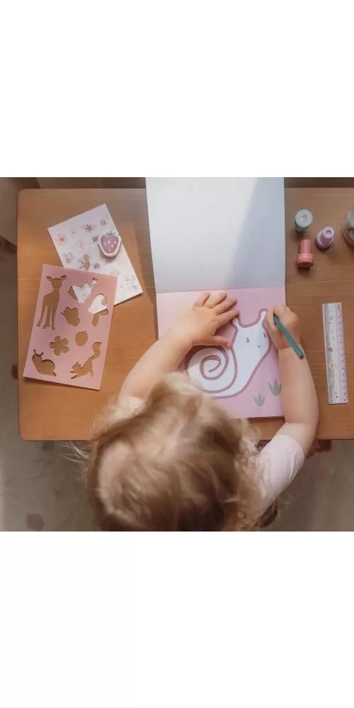 Sada výtvarných potřeb v krásném provedení s motivy na zahradě v lese obsahuje průhledné pouzdro na zip, sešit, samolepky, pravítko, gumu, ořezávátko a šablony.