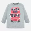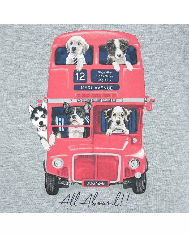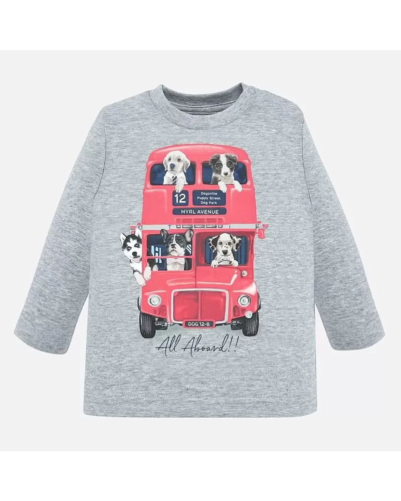 Krásné šedé tričko s dlouhým rukávem ideální pro podzimní sezónu pro malého chlapečka od kvalitní španělské značky MAYORAL. Jednoduché triko s kulatým výstřihem a obrázkem pejsků jedoucích na výlet autobusem pro velkou radost malých rarášků.