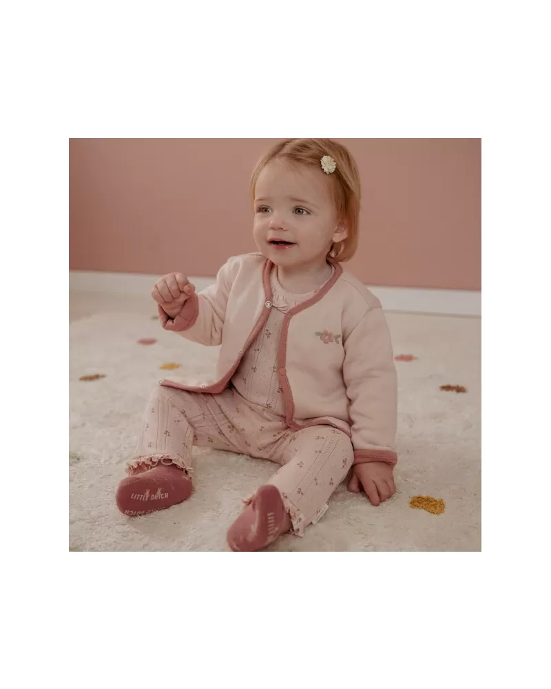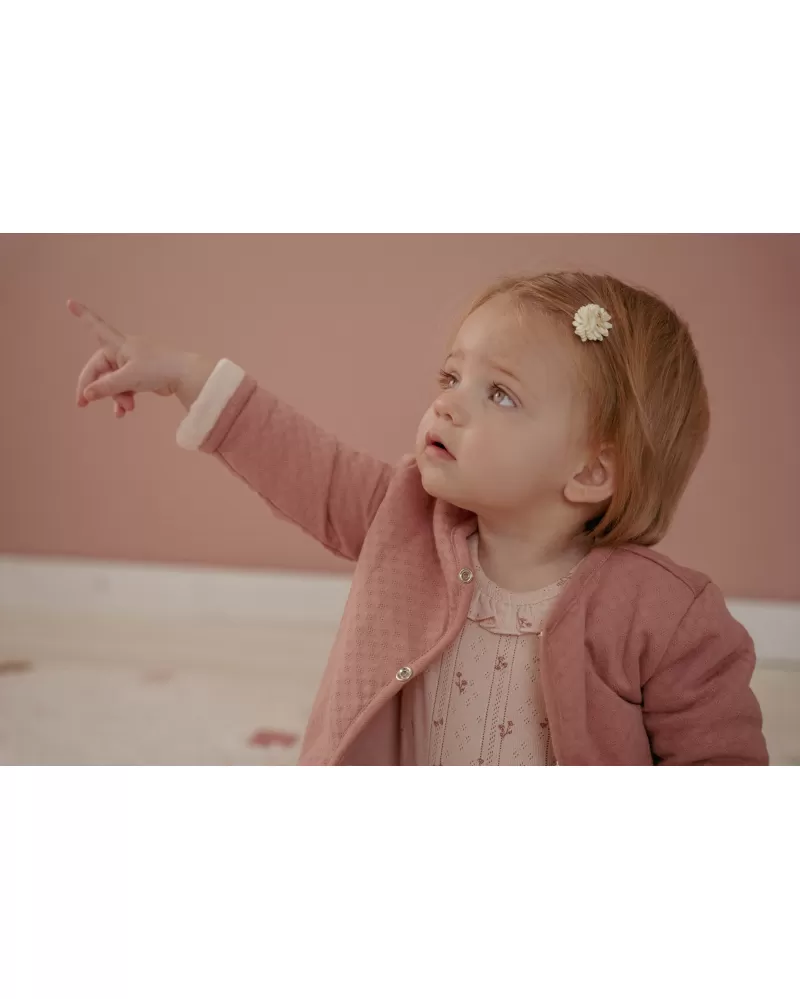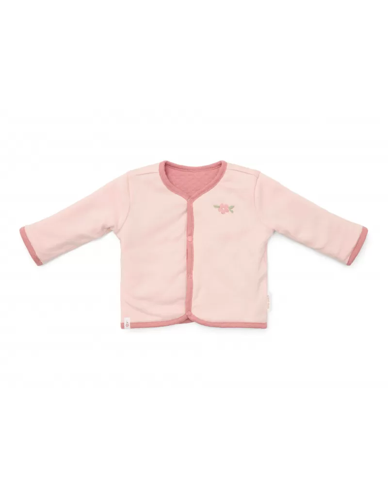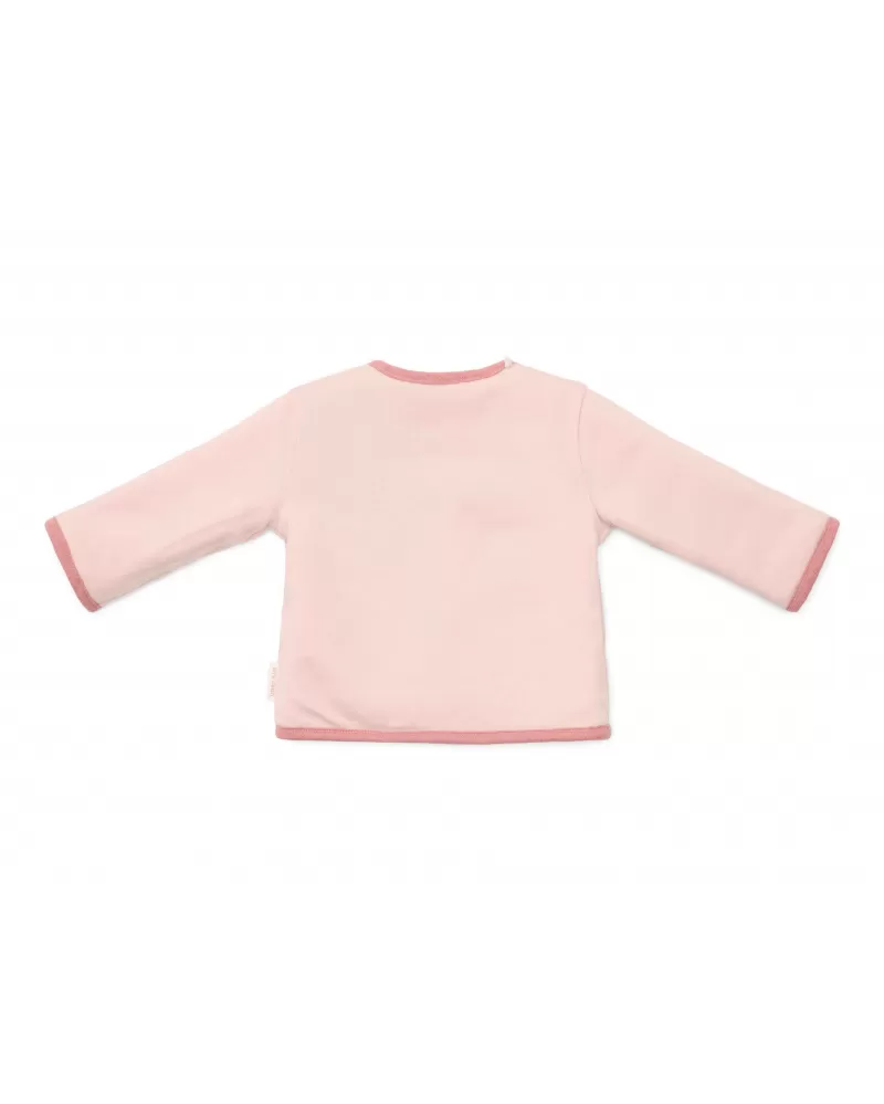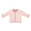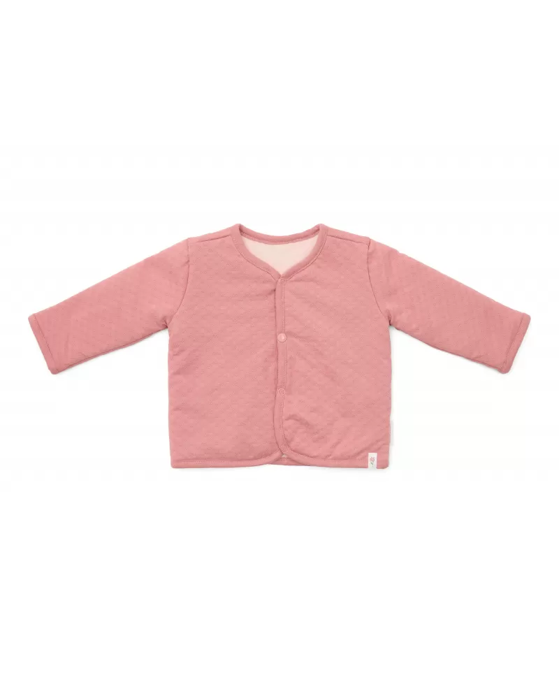 Stylový oboustranný kabátek z měkké organické bavlny poskytne vašemu dítěti díky dvojité vrstvě teplo a pohodlí. Oboustranné provedení nabízí dvě barevné varianty nošení - světle růžovou s výšivkou kytičky a tmavě růžovou s pleteným jemným vzorem. Kabátek se snadno obléká díky zapínání na patentky.