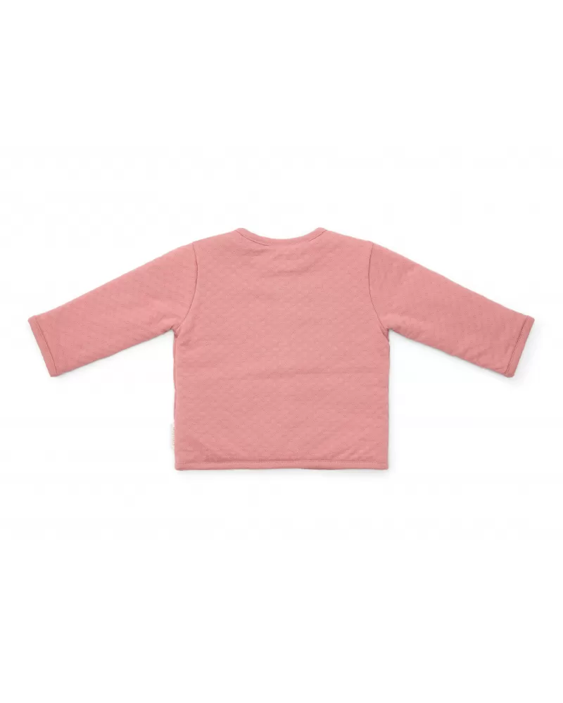 Stylový oboustranný kabátek z měkké organické bavlny poskytne vašemu dítěti díky dvojité vrstvě teplo a pohodlí. Oboustranné provedení nabízí dvě barevné varianty nošení - světle růžovou s výšivkou kytičky a tmavě růžovou s pleteným jemným vzorem. Kabátek se snadno obléká díky zapínání na patentky.