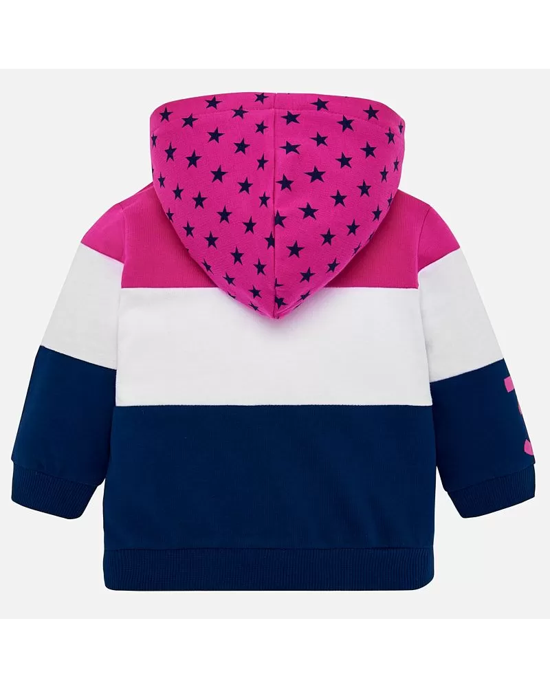 Krásná pruhovaná mikinka na rozepnutí s kapucí pro malého frajera od kvalitní španělské značky MAYORAL. Originální mikinka s ozdobnou kapucí hvězdičkami.