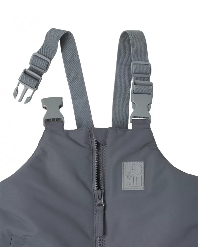 • příslušenství: plastový zip s kovovým jezdcem, silikonová nášivka s logem Leokid, elastické polyesterové šle, plastové knoflíky, plastové přezky s fastex zapínáním a silikonové pásky