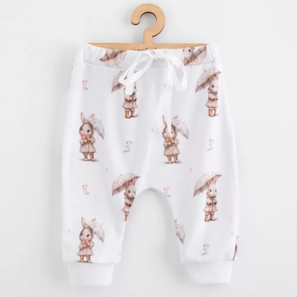 Kojenecké kalhoty jsou celopotištěné nápaditým dětským motivem. Pro snadné oblékání mají v pase gumičku, která netlačí a všitý ozdobný pásek na zavazování. Na hohavičkách jsou našité širší lemy.
