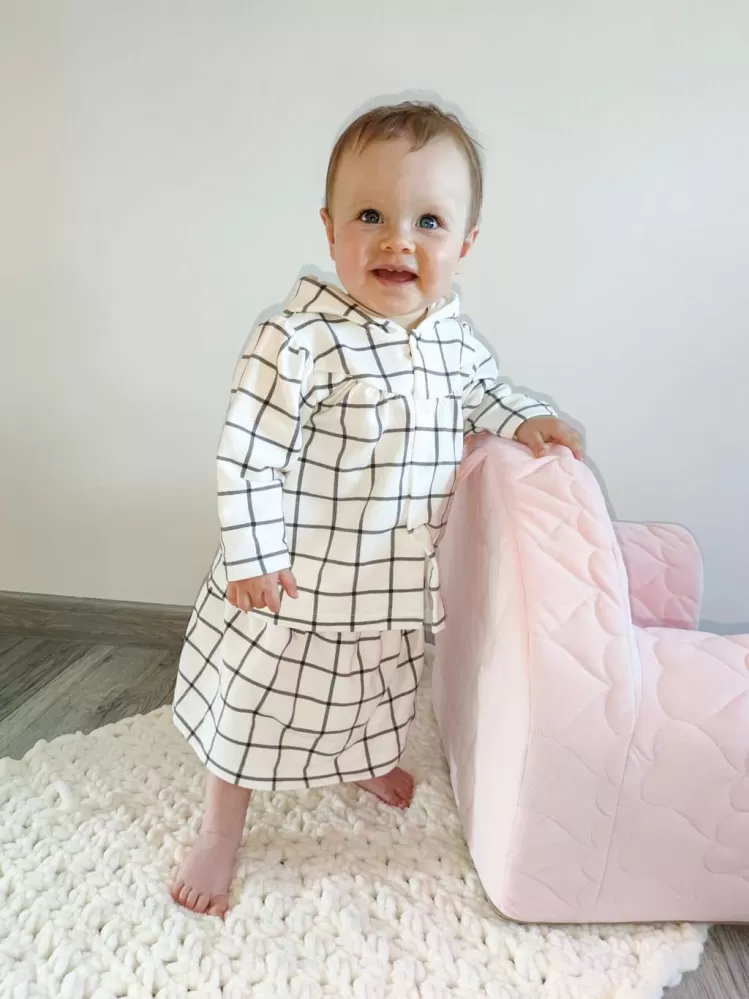2-dílný komplet pro holčičku české značky New Baby Cool Girls. Komplet se skládá z mikinky a sukýnky. Mikinku Áčkového střihu zdobí praktická kapuce podšitá bavlněnou podšívkou a stále moderní kostkovaný vzor. Zapínání na cvočky po celé délce. Kolový stříh sukýnky zdobí širší pás s gumičkou. Krásný komplet do šatníku malých parádnic. Materiál: 95% bavlna, 5% elastan.