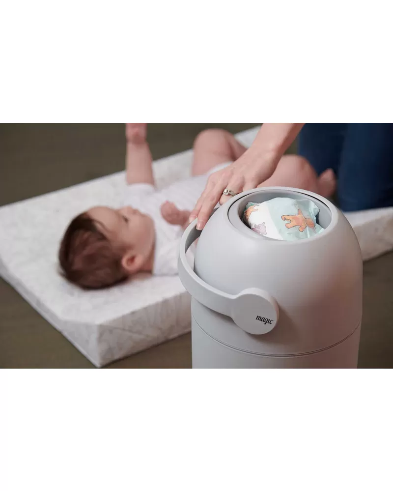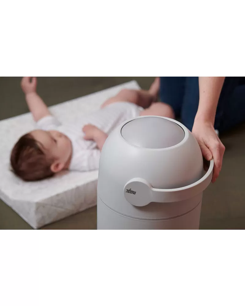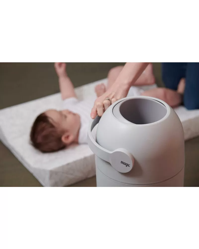 Patentovaný koš na pleny Magic poskytuje ochranu před nepříjemnými pachy a bakteriemi v dětském pokoji nebo kdekoli ve vašem interiéru. Použitou plenu snadno vložíte do koše bez jakéhokoli kontaktu s plenkami, které již v koši jsou. Otočením držadla plena propadne do koše a jeho otočením zpátky je koš opět připraven pro další použití. To vše jednou rukou, takže druhou můžete držet vaše miminko. Speciální systém těsnění udržuje zápach uvnitř koše.