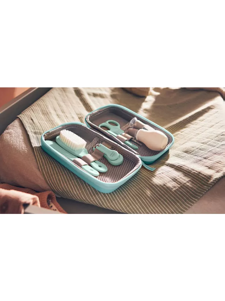 Kompletní péče o nehty s nůžkami se zaoblenými hroty, kleštičkami na nehty a třemi smirkovými pilníčky na nehty. Dále pak sada pro péči o vlasy s hřebenem se zaobleným koncem a měkkým kartáčem na vlasy.