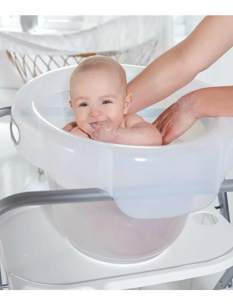 Bébé Bubble je pohodlný nejen pro Vaše miminko, ale také pro Vás samotné. Má široký lem, o který si pohodlně opřete předloktí při vodních hrádkách. I delší koupání Vašeho miminka bude pro Vás příjemné. Spolu s koupacím kyblíkem si můžete koupit kovový univerzální stojan dodávaný ve dvou výškách a tak si šetřit svoje záda. Koupání v koupacím kyblíku Vaše miminko nejen očistí, ale take pomůže tlakem vody uvolnit jeho peristaltiku. To oceníte, když ho bude nadmuté bříško bolet a ono nebude moci spát. Bébé-Bubble je lehce vyvýšený v zadní části a proto poskytuje podporu pro zádíčka i hlavičku. Vaše děťátko bude relaxovat v pozici, na kterou bylo zvyklé již u maminky v bříšku, od momentu svého narození až do 6 měsíců. Vnitřní ryska informuje o doporučené výšce hladiny vody.