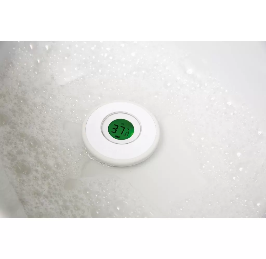 Digitální koupací teploměr LUMA se automaticky aktivuje, když přijde do kontaktu s vodou a plave tak, aby bylo možné spolehlivě vidět displej. Modrá znamená příliš chladno, červená znamená příliš teplo a zelená je akorát. Kromě barevného indikátoru lze odečíst přesnou teplotu vody. Na displeji je také indikátor stavu baterie. Teploměr se po použití automaticky vypne. Teploměr můžete snadno vyčistit, sejměte víčko, otřete jej a je čistý.