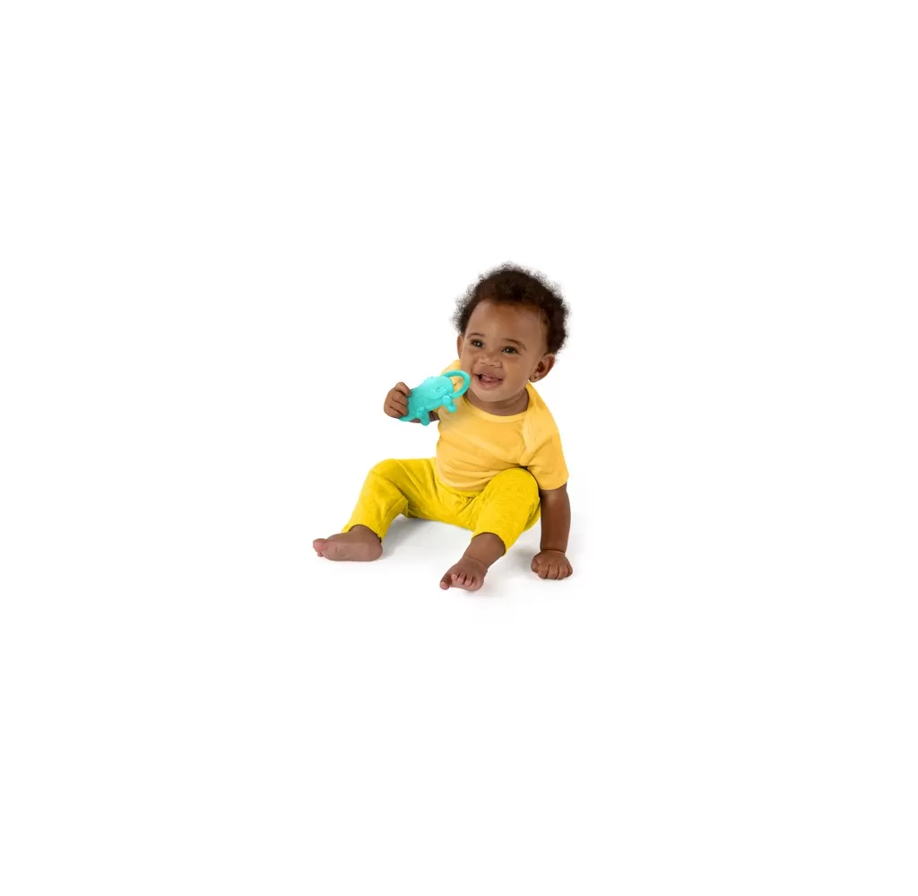 Pomozte svému dítěti zkrotit bolest při prořezávání zoubků pomocí silikonového kousátka Tame Your Tusks od Bright Starts. Děťátko si zamiluje tuto jasně modrou figurku slona s velkýma ušima, kterou může uchopit a uklidnit. Rodiče si zamilují netoxický a přírodní silikonový materiál bez BPA. Silikon je mimořádně měkký na dotek a extrémně odolný, což vytváří bezpečné a příjemné kousátko. Tento sloní kamarád s jednotným tělem má různě strukturované povrchy, které uklidňují bolavé dásně dítěte. Díky snadno uchopitelnému designu ho může dítě pevně držet a masírovat si dásně, kdykoli je to potřeba. Tento kamarád z džungle podporuje rozvoj jemné motoriky a smyslových dovedností, protože dítě kouše a chytá barevné sloní uši, chobot a další věci. Pomozte dítěti zkrotit jeho rostoucí zoubky pomocí tohoto poutavého kousátka. Čištění je mimořádně snadné, stačí jej otřít vlhkým hadříkem a jemným mýdlem. Nechte uschnout na vzduchu. Neponořujte do vody. Ideální pro děti od 3 měsíců.