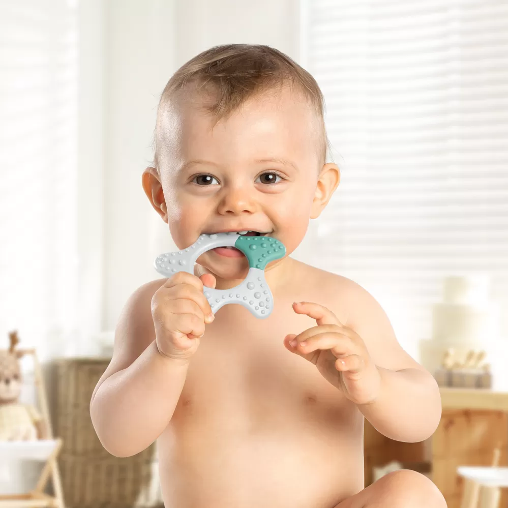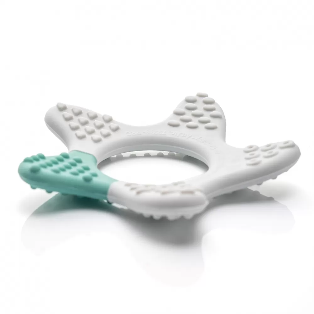 Velké masážní plochy, zklidňující až po stoličky. Pro podporu prořezávání zoubků. Různé povrchové struktury podporující hmat. Snadné uchopení a držení. Lze snadno připevnit na popruh dudlíku.