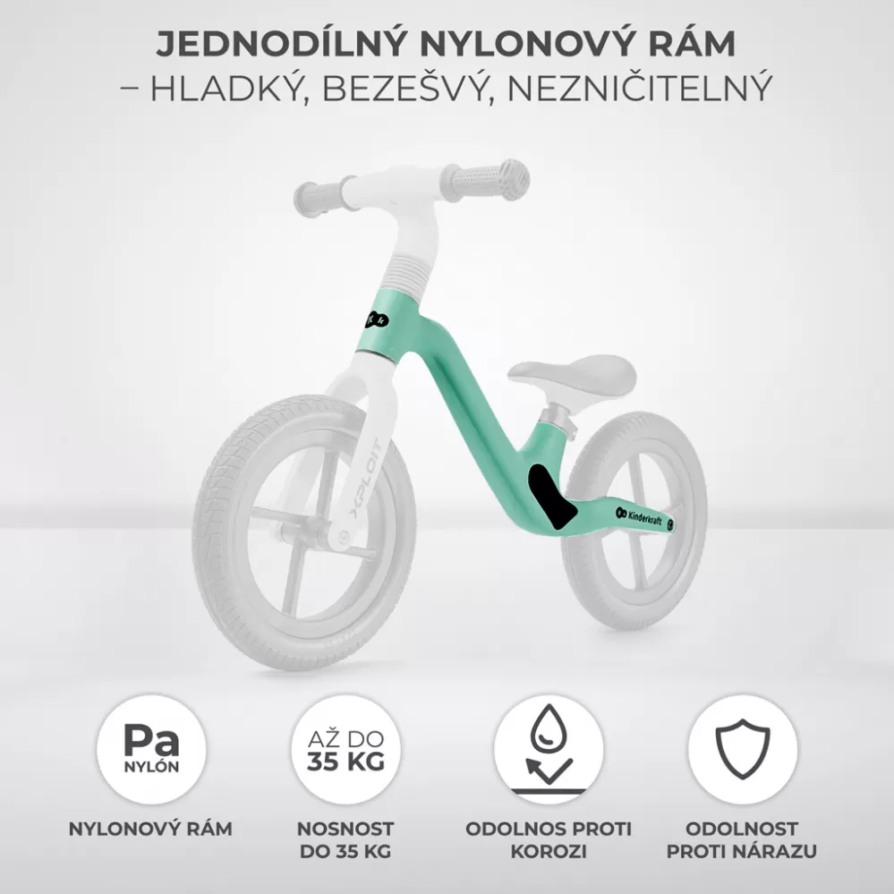 Dětské odrážedlo XPLOIT snese jakékoli podmínky při procházce. Je vyrobeno z lehkého odolného nylonu: jednodílný rám je odolný vůči korozi a nárazům a zároveň má hladkou povrchovou úpravu, takže je bezpečné a pohodlné pro děti. Samotné dětské kolo je lehké (rám váží necelé 1 kg) a má sportovní styl, bude jako stvořený pro každého malého sportovce.