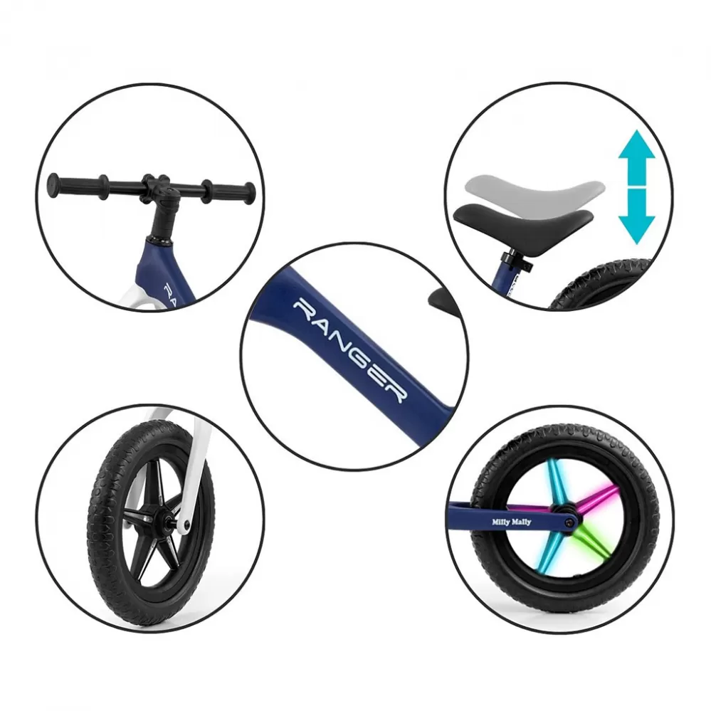 Odolná a vyrobená nejmodernější technologií z pěny EVA. 12" kola, která se nepropichují a není třeba je nafukovat, jsou bezúdržbová. Ergonomické výškově nastavitelné sedlo s měkkým polstrováním zajišťuje pohodlí dítěte a roste s ním. Kolo Ranger Flash má ložisková řídítka a ložisková kola. Protiskluzové rukojeti z měkké gumy zajišťují bezpečné uchopení a pohodlnou manipulaci.