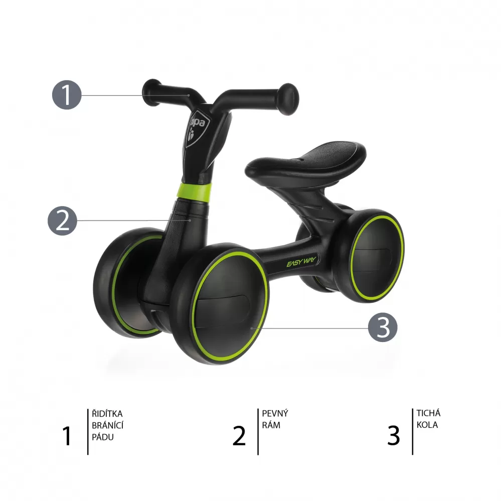 Odrážedlo Easyway je novinkou pro zábavu vašich dětí od 18 měsíců. Sportovní design se opírá o robustní konstrukci s pevným rámem. Samozřejmostí jsou zde kolečka s technologií „silent wheels“ pro tichou a bezhlučnou jízdu. Volit můžete z několika barevných provedení.