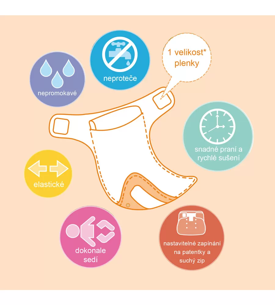 Praní v pračce na 60°C. Nepoužívejte chlorové čističe. Může sa sušit v sušičce na nízkou teplotu. Nežehlit. Při praní musí být suché zipy vždy zapnuté, aby se zabránilo poškození plenek.