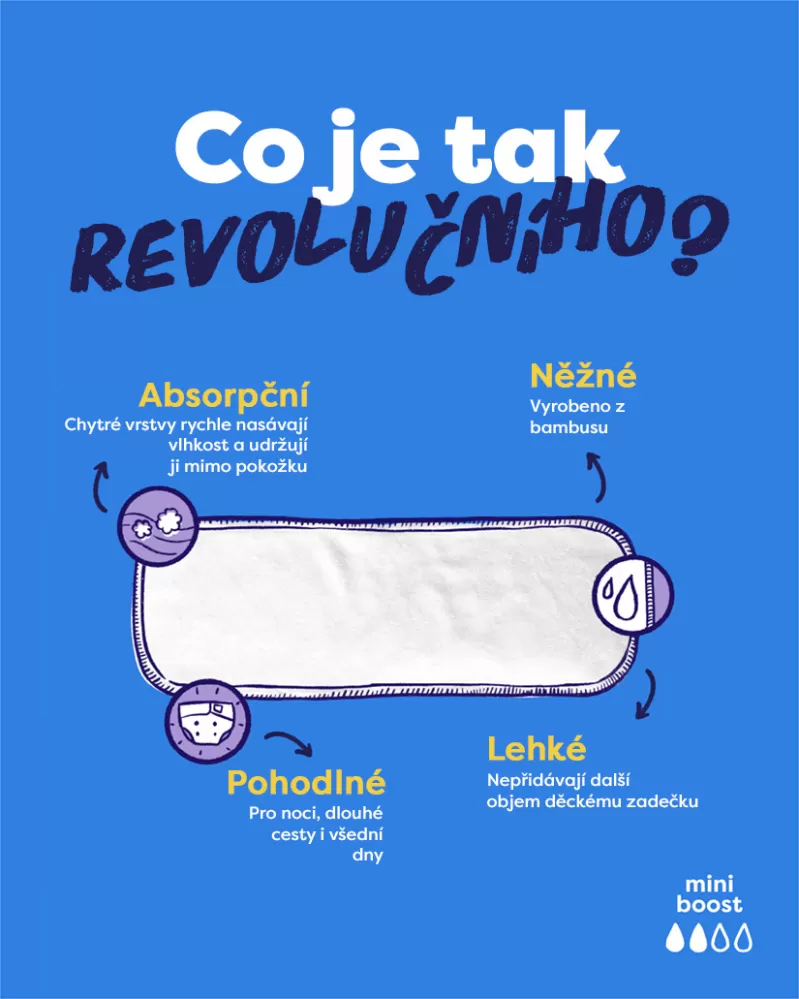 U novorozenců je objem žaludku velmi malý cca 6 ml. Jak dítě roste, zvětšuje se i objem jeho žaludku, v 1 měsíci 80-150ml. Spolu s rostoucím žaludkem, roste i množství, které dítě skonzumuje a prodlužuje se doba mezi kojením. Proto zpočátku stačí kapacita samotné plenky, později přidáme absorpční vkládací vložku mini boost, která téměř nezvětší její objem, ale zdvojnásobí jeji kapacitu.