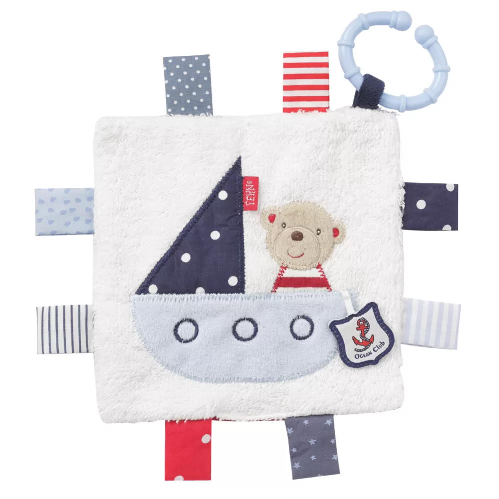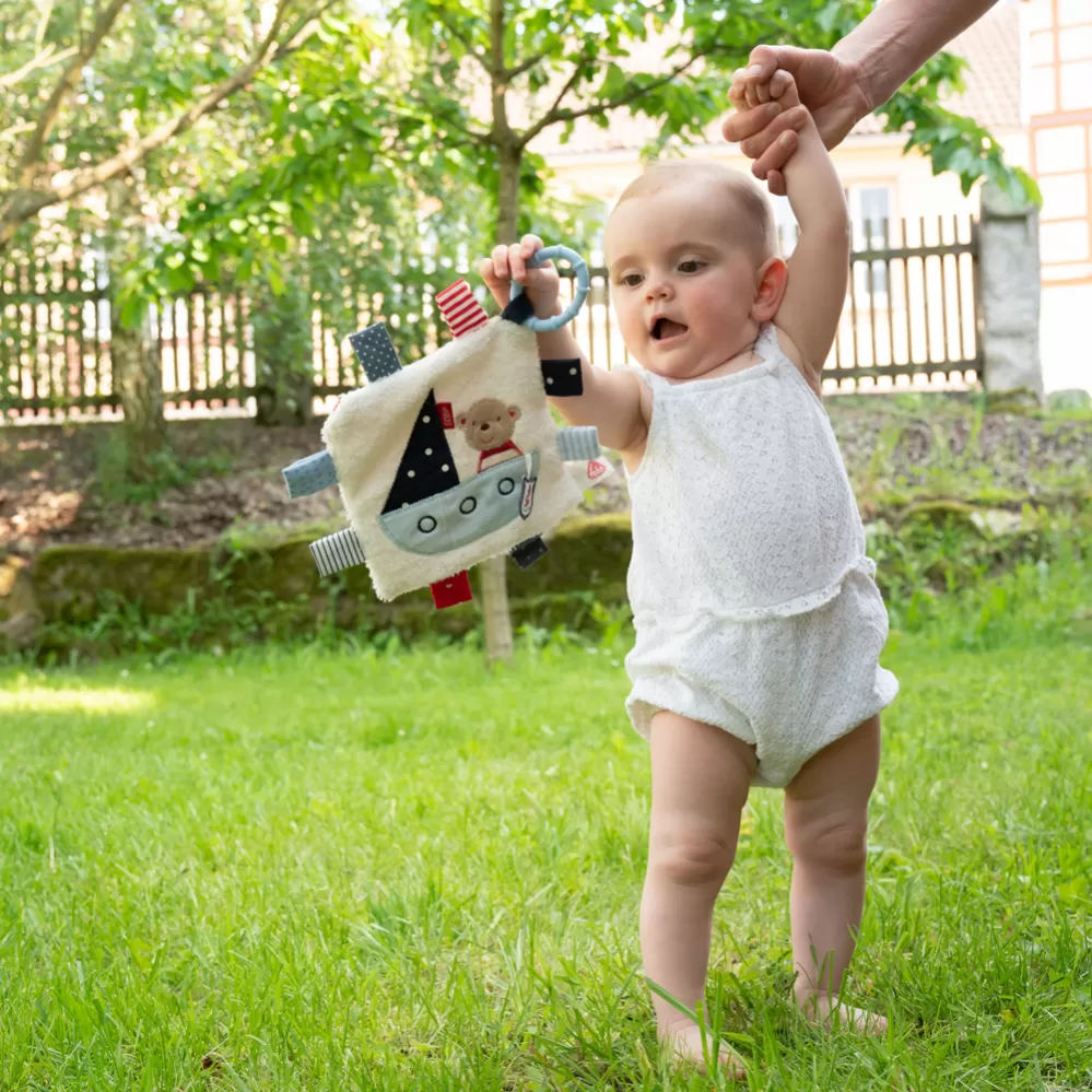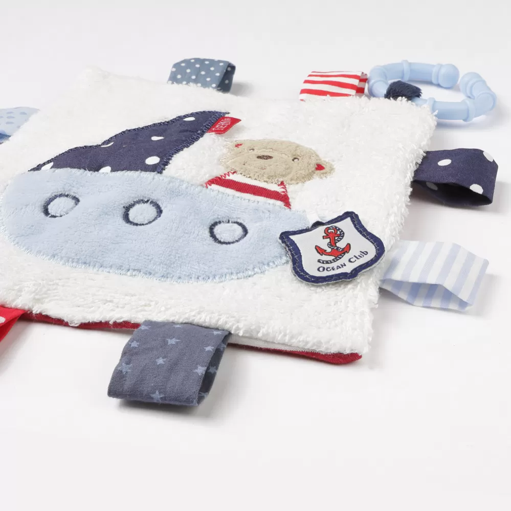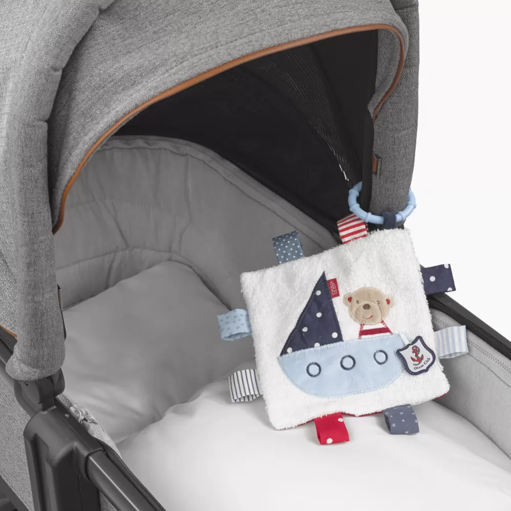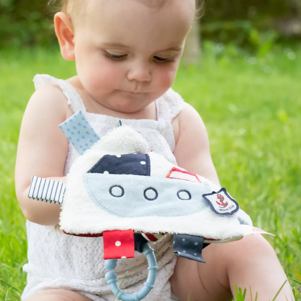 Drobnou hračku Teddy v lodi z kolekce Ocean Club lze snadno připevnit na kočárek, autosedačku, ohrádku či postýlku, a to pomocí praktického C-kroužku. Přičemž její různé herní funkce děťátku přinesou vždy dobrou náladu. Postará se o to zvrásněný papír, pískání a různé dotekové prvky, které podněcují jeho zvídavost a trénují sluch a hmat. Tyto různé měkké materiály a roztomilý námořnický design zvou k mazlení a zkoumání. Je tedy jisté, že parádní muchláček bude dítěti tím nejlepším společníkem doma i na cestách.