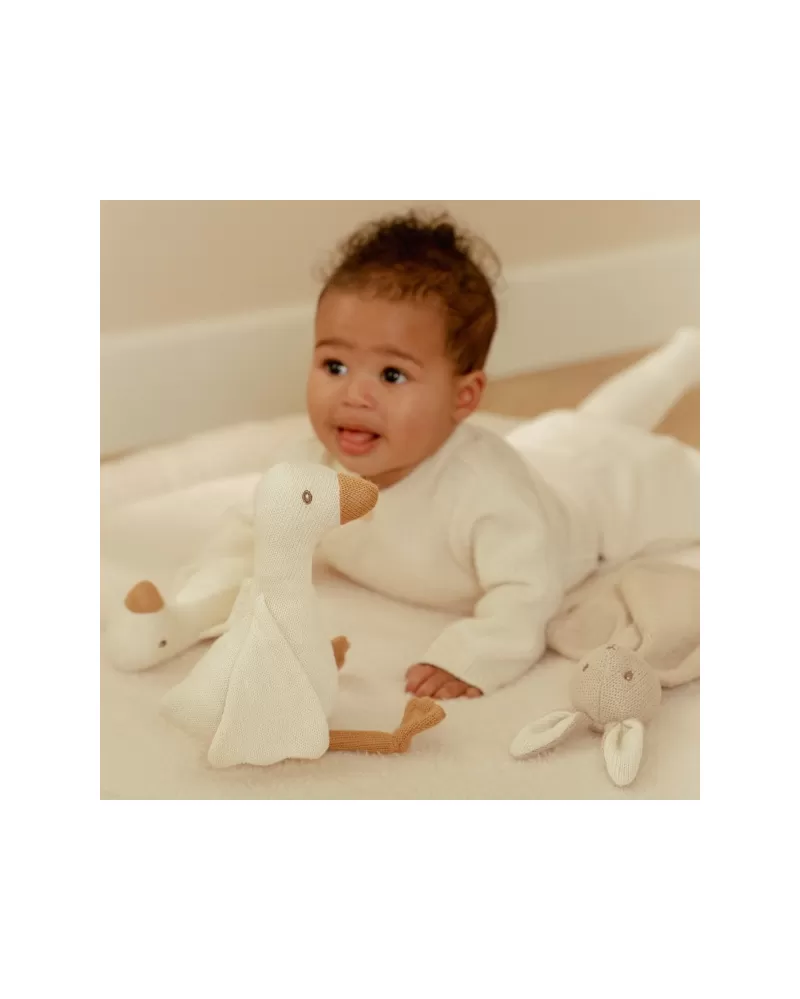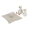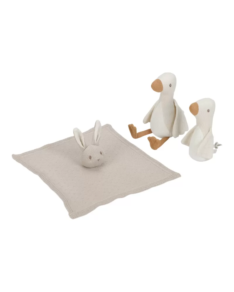 Krásná dárková sada hraček z jemné pleteniny je ideální jako dárek pro novorozené miminko. Sada obsahuje muchláčka s králíčkem a dvě hračky v podobě husy.