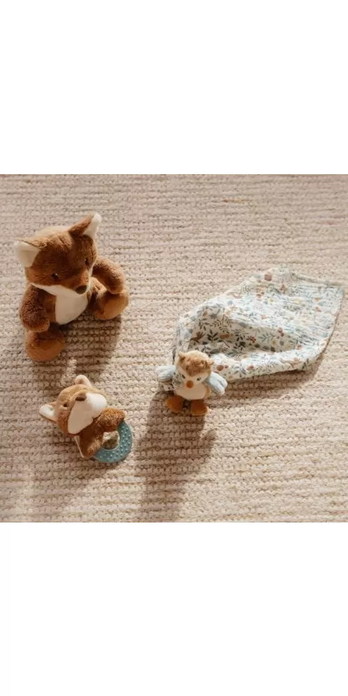 Krásná dárková sada plyšových hraček je ideální jako dárek pro novorozené miminko. Sada obsahuje kousátko s liškou, muchláčka se sovou a plyšovou lišku.
