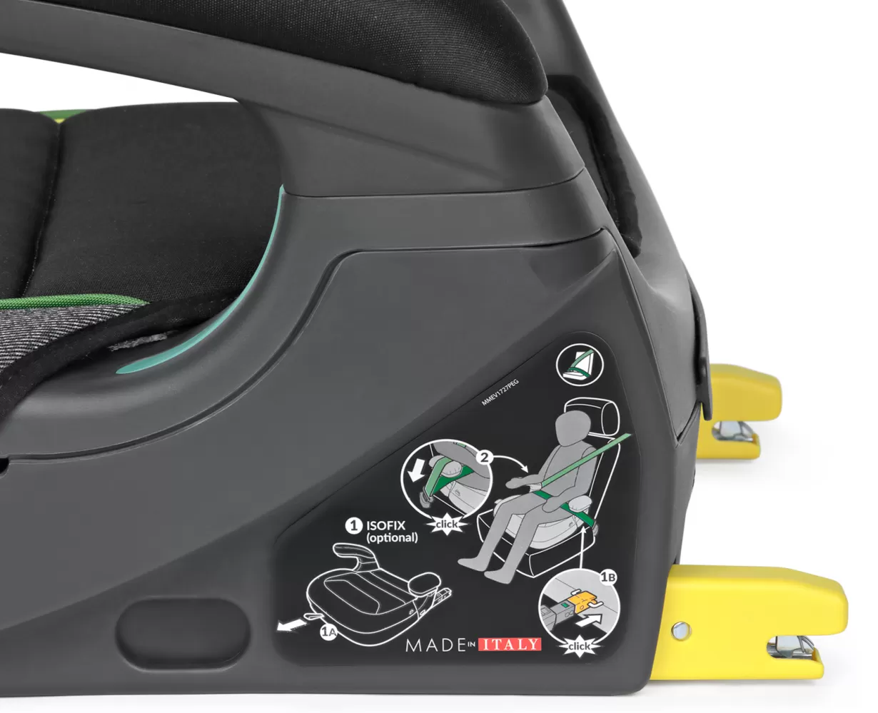 2) díky integrované i-Size Base lze společně s 3bodovým bezpečnostním pásem použít také ISOFIX konektory a připojit tak podsedák přímo ke kotevním bodům ve vozidle. Podsedák je tak vždy správně nainstalovaný a dokonale drží i v prudkých zatáčkách.
