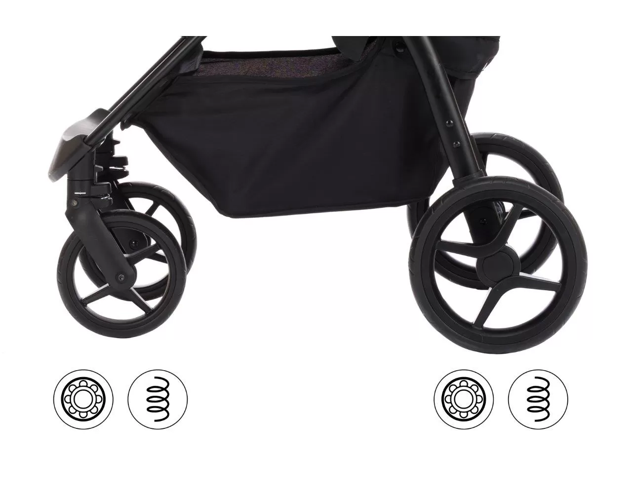 Dlouhé nastavitelné opěradlo zajišťuje, že kočárek můžete používat delší dobu a pokud se malý pasažér unaví, je to skvělé místo, kde si může zdřímnout. Velká kola s kuličkovými ložisky a odpružením vás bezpečně a pohodlně převezou po jakémkoli povrchu,