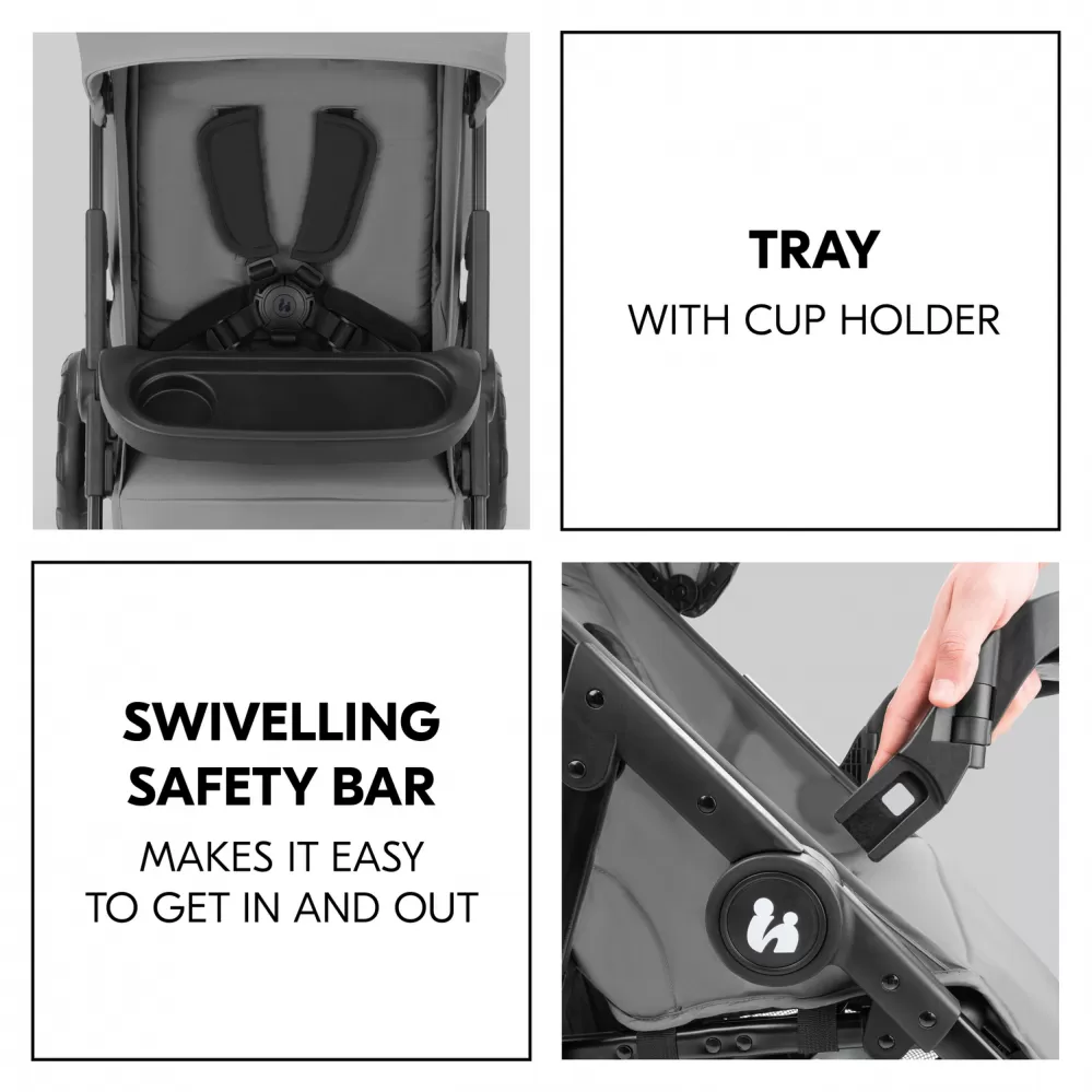 ODNÍMATELNÝ OCHRANNÝ OBLOUK S PULTEM // Má vaše dítě rádo svačinky na cesty? Právě proto je kočárek SHOP N CARE vybaven praktickým pultem s držáčkem na pití. Díky odnímatelnému oblouku může navíc vaše maličké snadno nastupovat / nebo vystupovat, jak potřebuje.